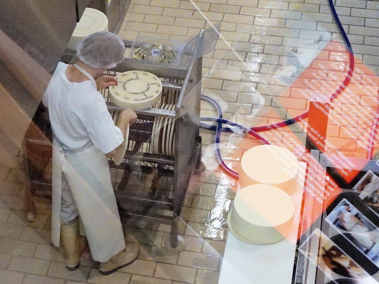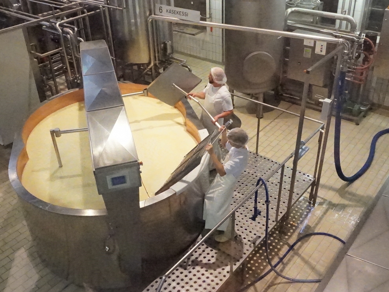 ミルクが入った大きな槽をかき回すのも、チーズをひっくり返すのも機械ですが、固まったばかりのチーズを取り出して、製品を管理するプレートをつけるのは人の手でした。