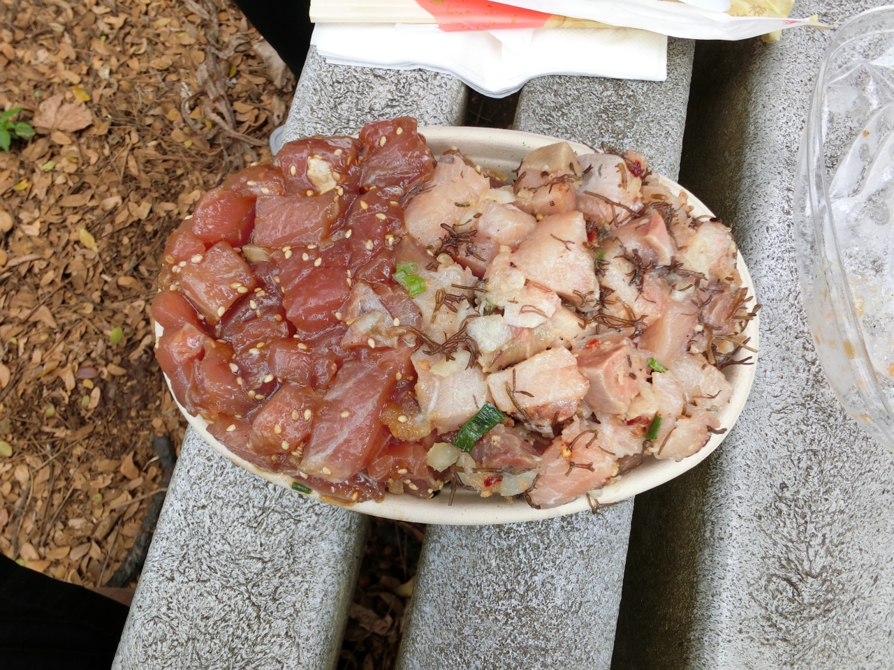 ヒロに行ったらここでポケ丼を食べてほしいです。2チョイスのポケボウルを買いました。ごはんにふりかけをかけてくれて2種類のポケを選びます。マグロの醤油ポケとハマチのポケを選びました。ハマチのポケは初めて食べましたが、油がのっていてとてもおいしかったです。量が多いので、主人とシェアして丁度よかったです。店のすぐそばに公園があるので、そこのベンチに座って食べました。