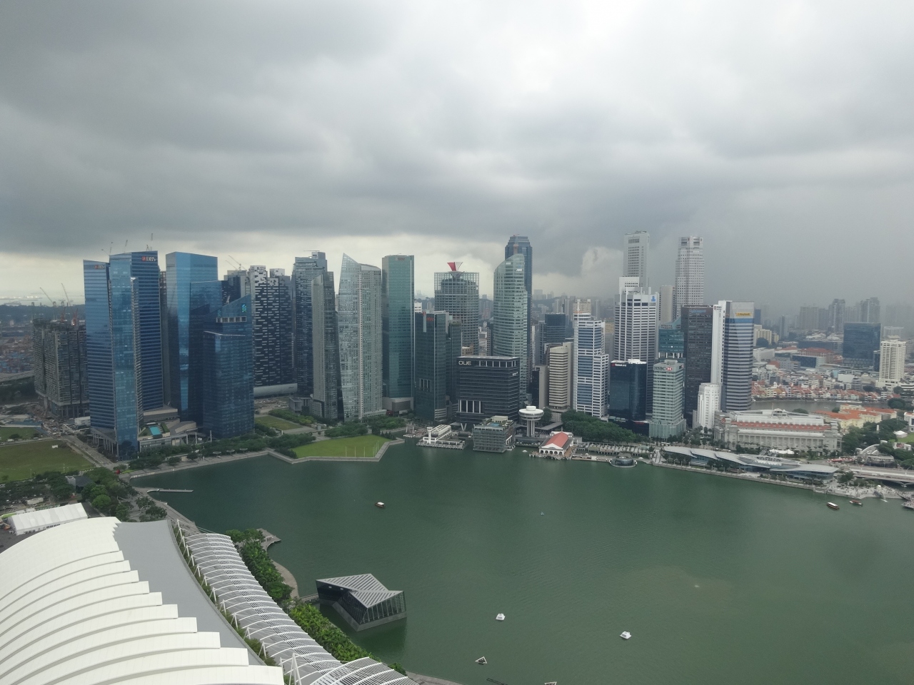 マリーナ・ベイ・サンズ屋上の船になった部分が展望庭園になっています。シンガポール湾を挟んで高層ビルがたくさん林立しており、シンガポールらしい風景を堪能できました。プールもちらっと見えますが、宿泊者専用だそうです。