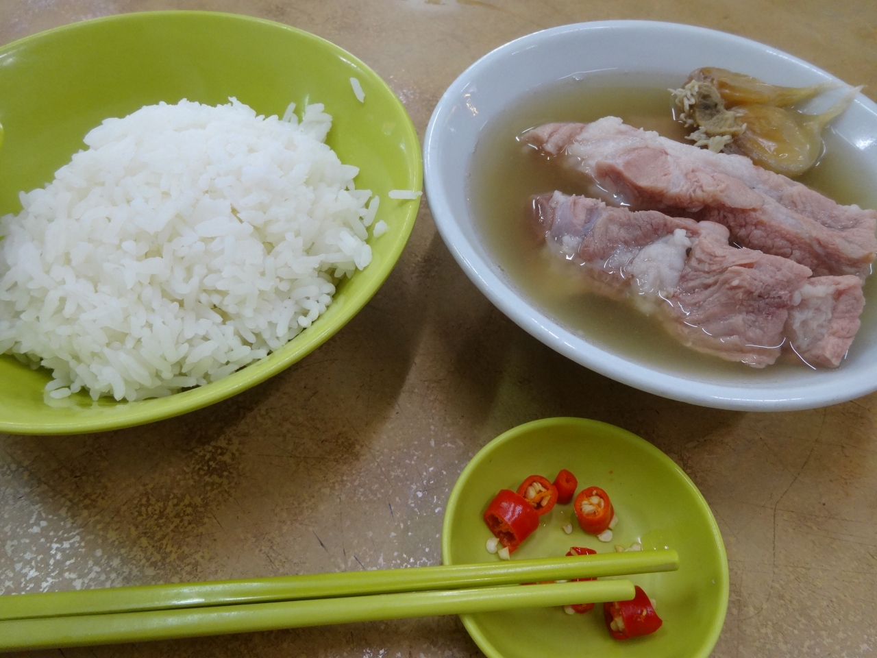 チャイナタウンにある、飲食店がたくさん並ぶストリートです。基本オープンカフェ形式の座席で食べることになります。朝訪問したので、バクテー(骨肉茶)をオーダーしました。濃いめのスープとご飯の相性は抜群でした。