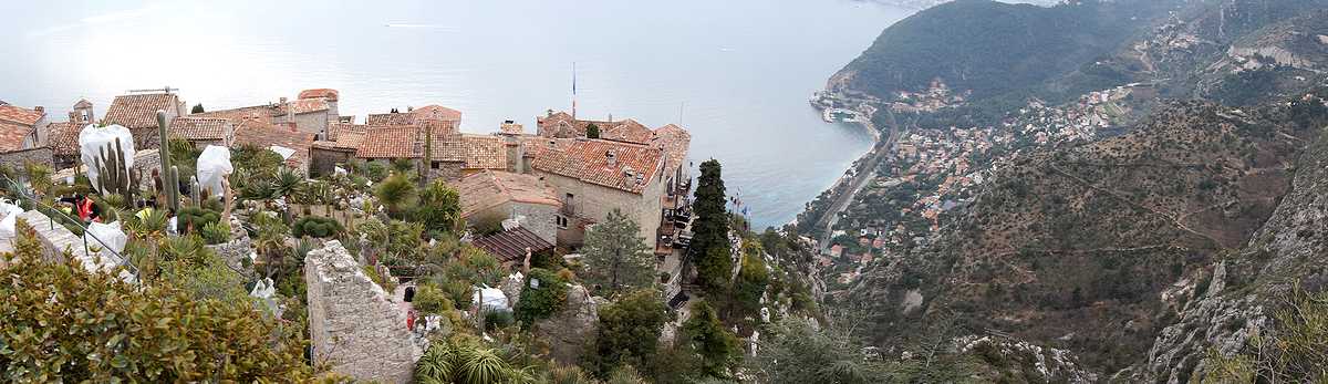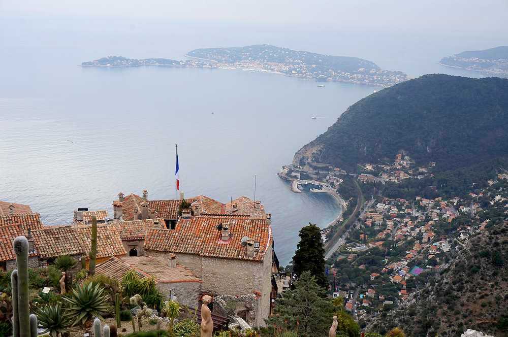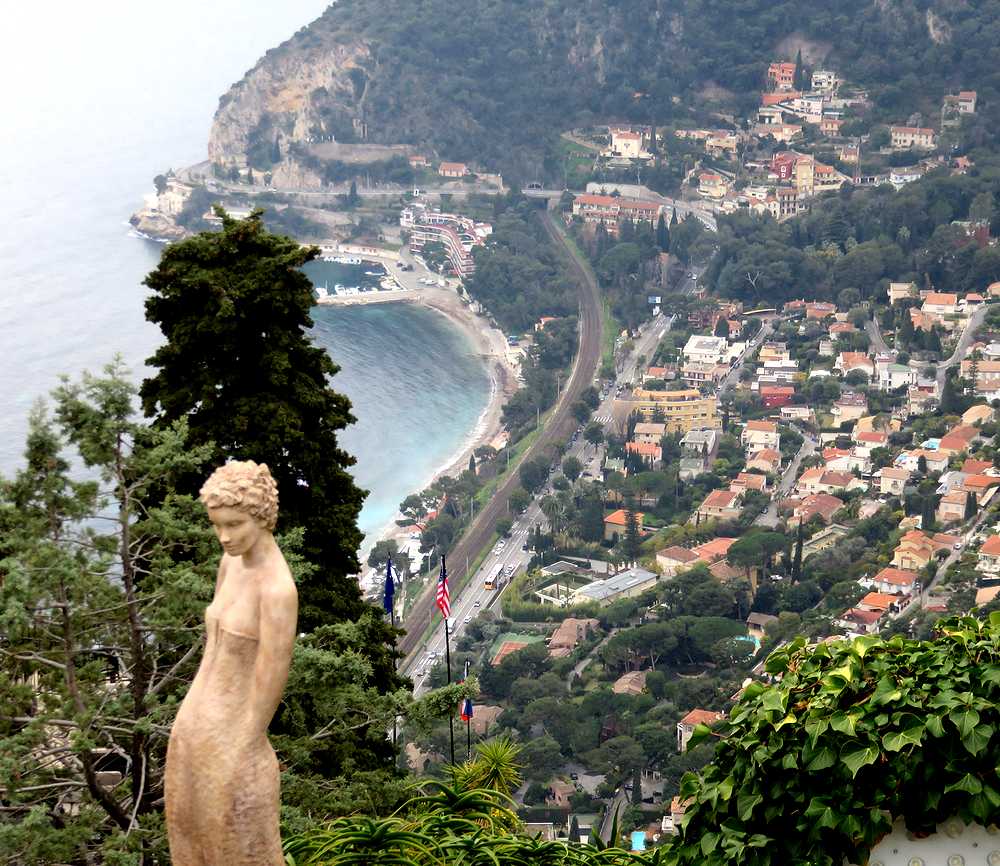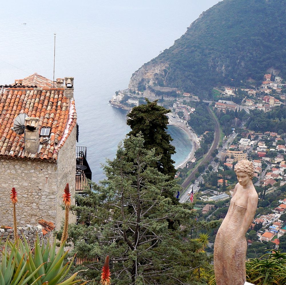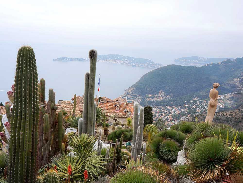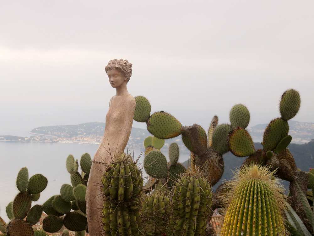 エズへは2回訪れました。1回目は20年前にニースからバス、2回目は2018年にエズ駅から83番のバスに乗り換えて訪れました。2回目に訪れた時は2月でシーズンオフのせいか、入園料が6ユーロから4ユーロに値下げされていました。また庭園内は日当たりがいいせいかサボテンの他にかわいい花が咲いていました。植物の間にスレンダーな女神像がいくつか配置され、景色のアクセントになっていました。坂道を登り切ったところに展望台があり、そこからのコートダジュールの海岸の眺めは必見です。午後には逆光になるので、午前中に訪れるようにした方がいいでしょう。2回目の訪問時は10時過ぎに訪れましたが、残念ながら薄日の差す曇天で、青空ではなく、海の色はいまいちでした。