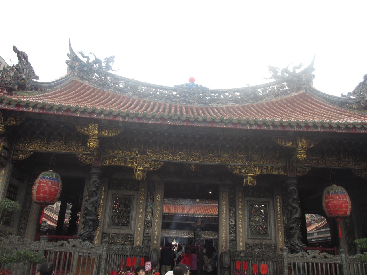 台北に3泊4日で個人旅行をしました。その際の最終日の午前中に龍山寺にお参りしました。龍山寺は台北の中でもっとも有名な寺院のようで、とても沢山の人がいらっしゃいました。こちらの前殿は人が多かったので通り抜けるのがやっとという感じでした。