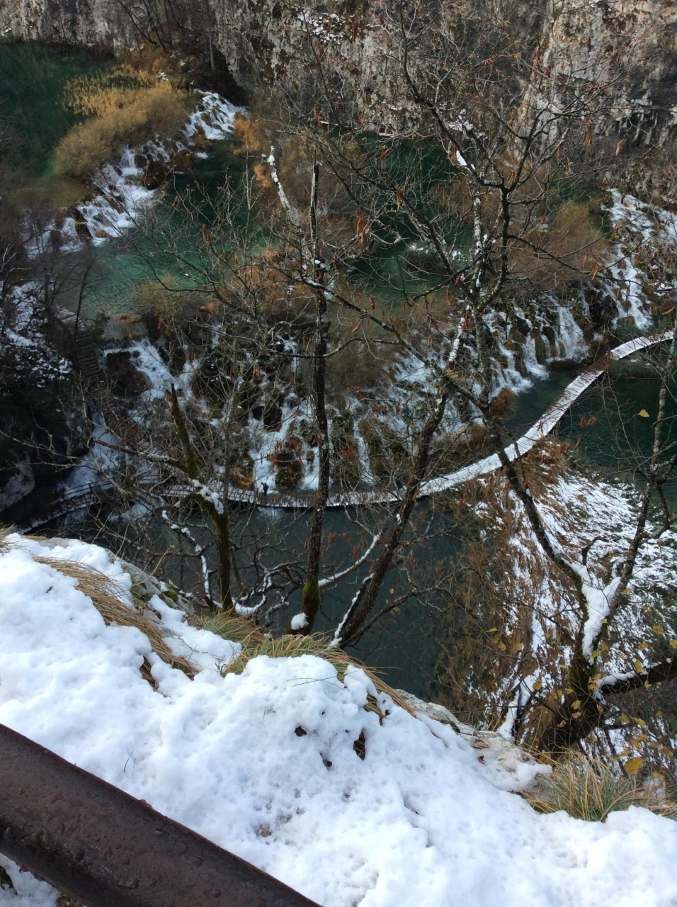 11月の後半にプリトヴィツェ湖群国立公園へ行きました。前日から雪が降って積もっています。この場所は内陸部になるのでかなり寒いです。私たちは事前に言われていたので服装や靴の装備は怠りなくしていたので何も心配なく歩けました。でもこの時期はお勧めです。観光客の方が少ないからゆっくりと見て廻れます。