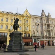 イェラチッチ広場の中央に建つイェラチッチ総督の騎馬像。剣をたかく掲げ、馬はいまにも走り出しそうです。勇ましい姿の立派な銅像は、観光客なら誰でも立ち止まって見ると思います。広場はトラムが前を走っているので、1日中、人が絶えることがありません。