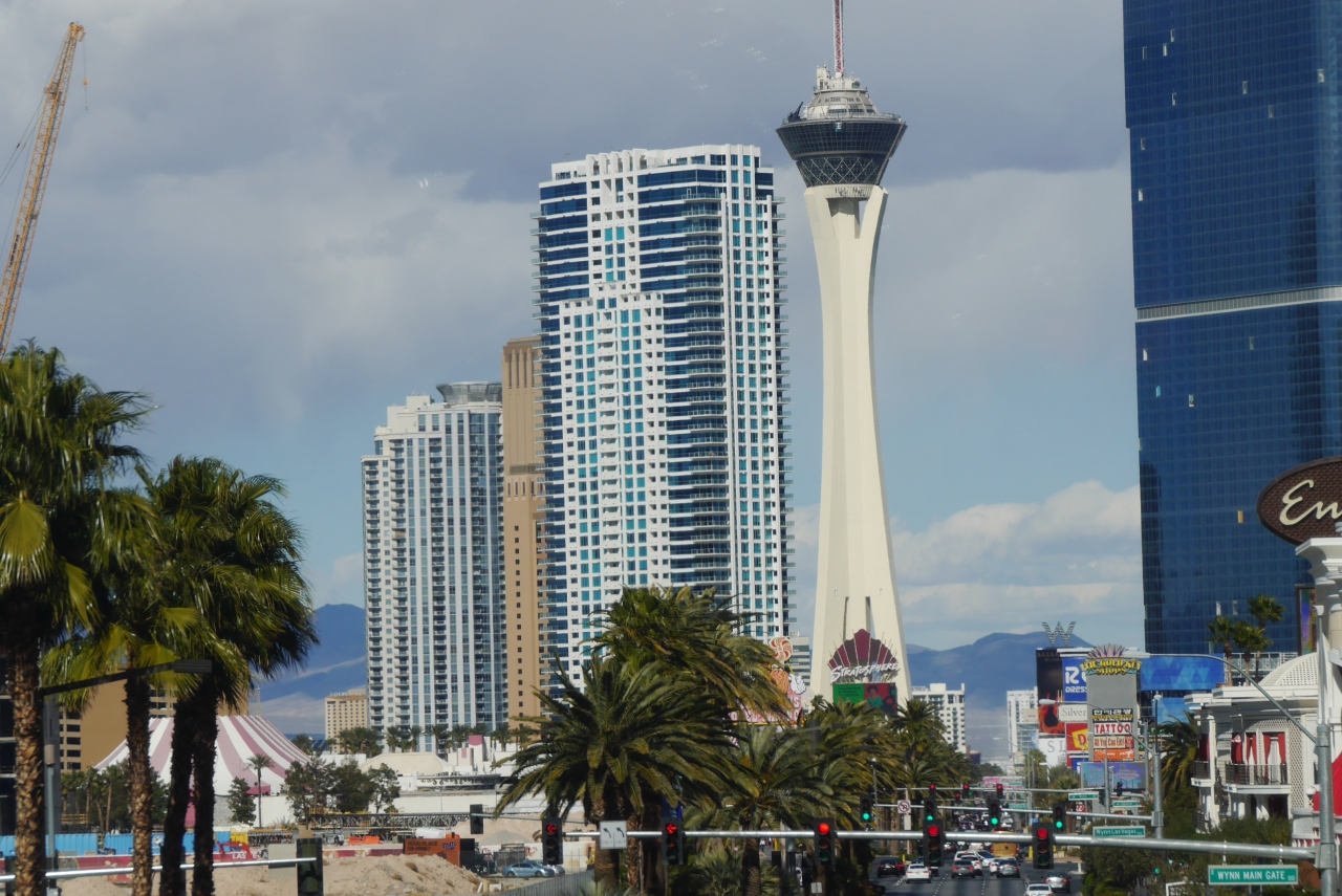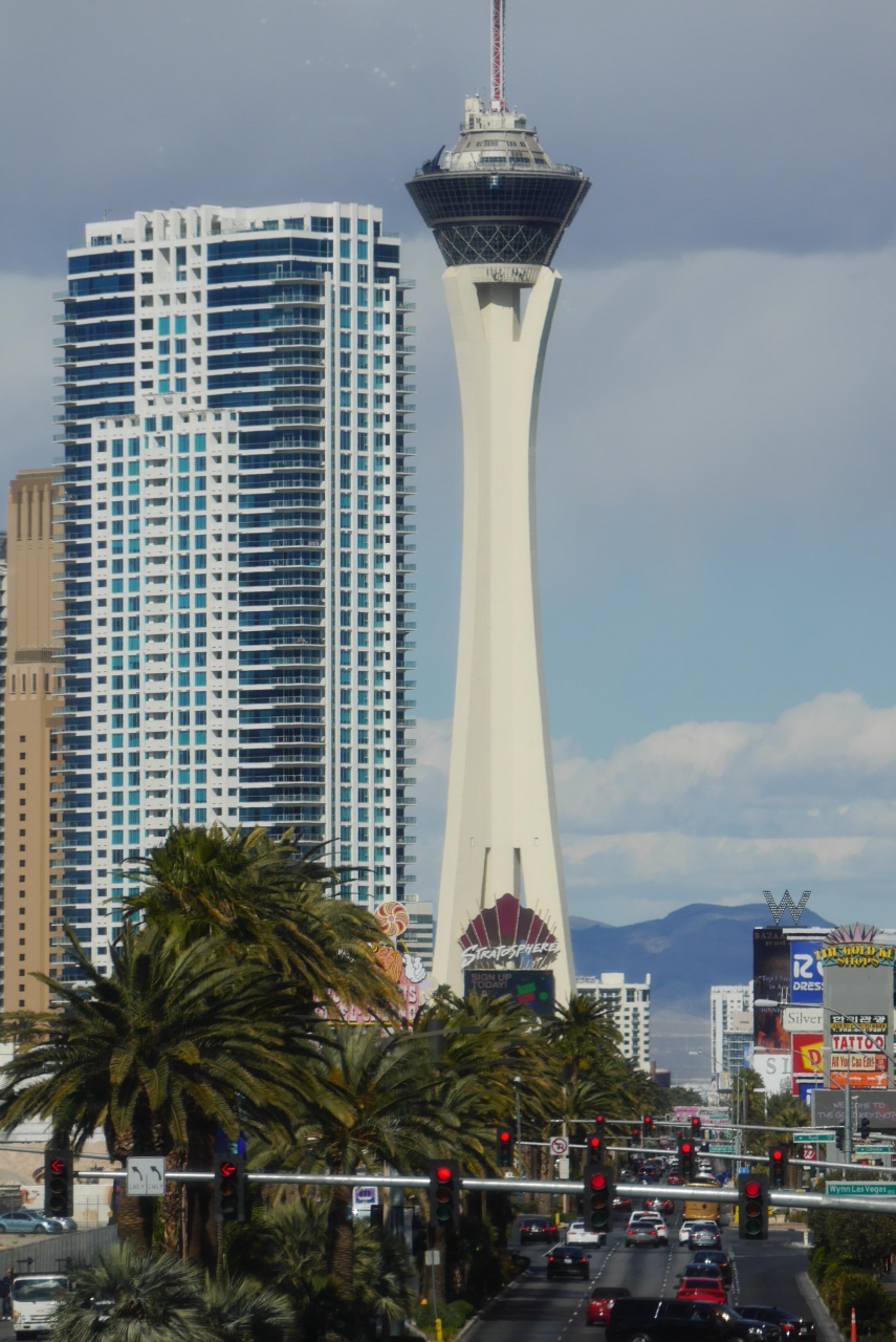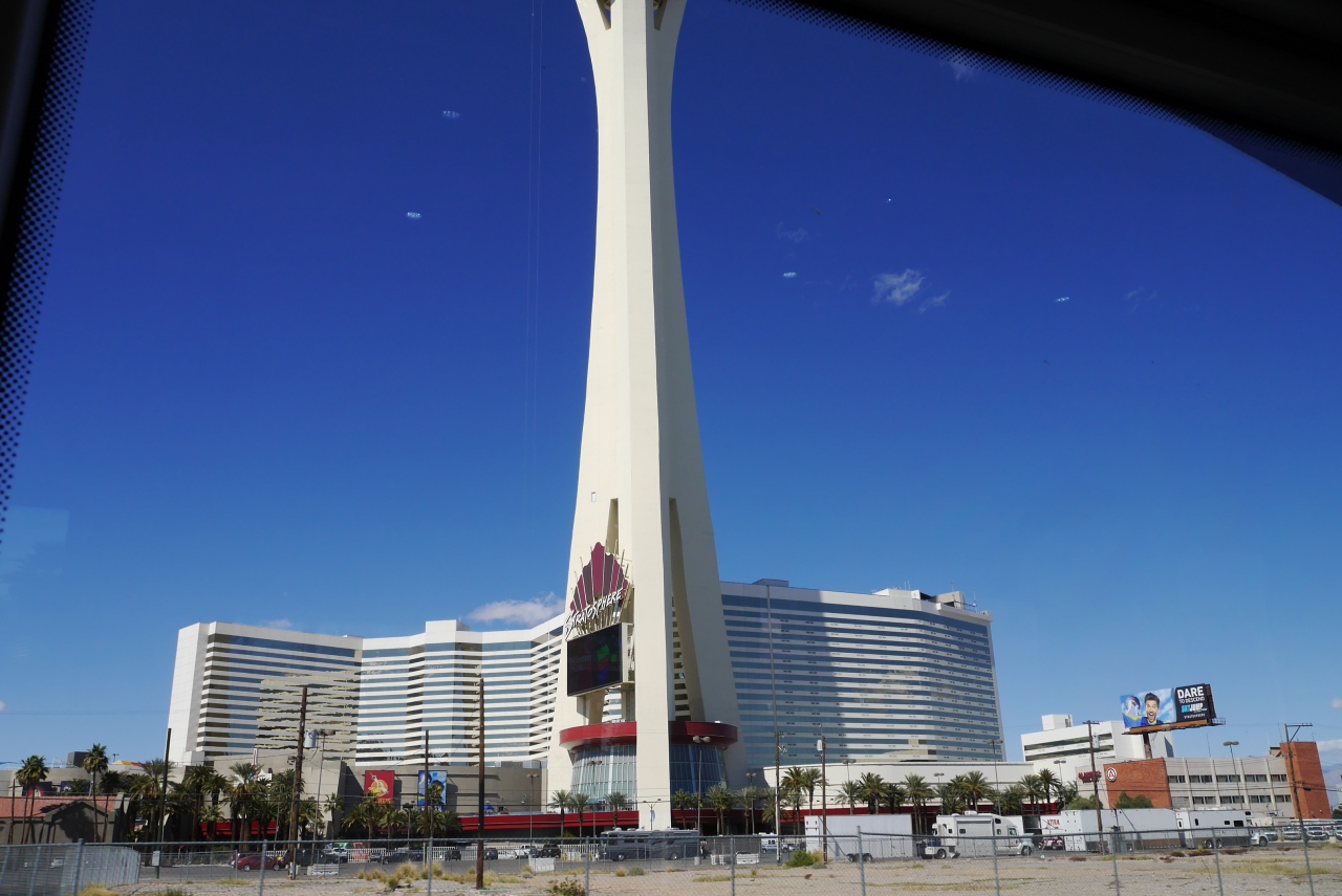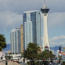 ラスベガスストリップの北側、ダウンタウンの南側に位置し、周辺には目立つ建物は少なく、他のホテルとも離れています。ウィン前の歩道橋から見るとストリップの正面に建っているように見えます。タワーが他には少ないのでラスベガスのランドマークになります。