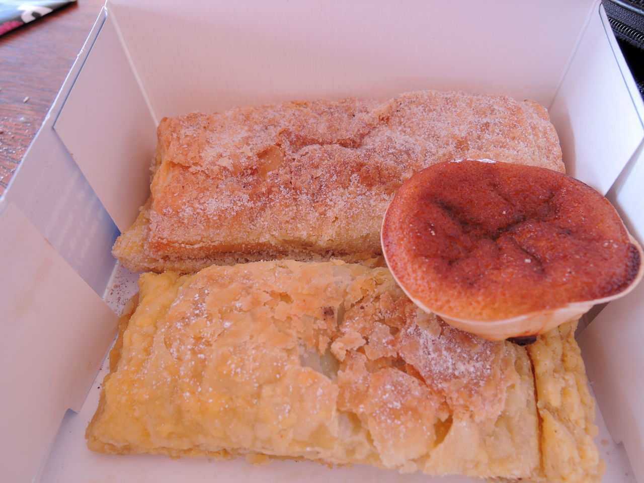 トラヴェセイロ(travesseiro、ポルトガル語で”枕”)は1.4ユーロ。チョコレート1.3、ユーロ、Maca1.3ユーロ。パリパリとした何層ものパイ側にグラニュー糖をまぶしたもの。中身もいろいろあります。