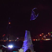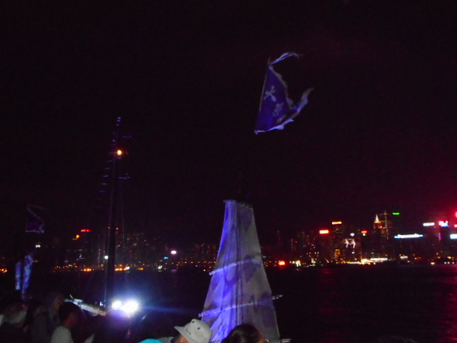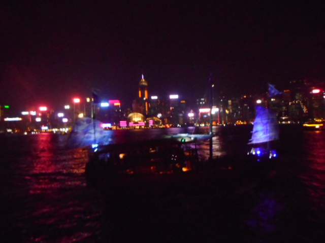 香港島の夜のシンフォニー・オブ・ライツ見物に乗船しました。ビクトリア湾を大きな帆掛け船が風にはためき、幻想的でしたが、少々、お高いのではと思いました。これなら、無料の湾沿いでも見物できますが、そこは趣向を変えての高みでした。
