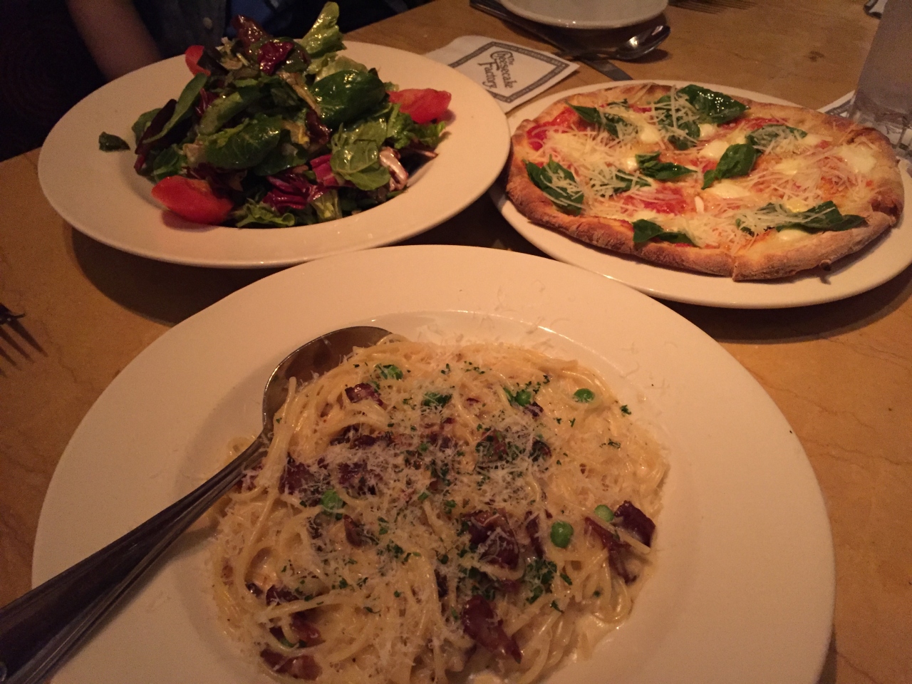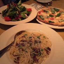 ランチの時間帯だったのでランチスペシャルをオーダー。ランチピザ&サラダ(マルゲリータ)13.95ドルとランチパスタ(カルボナーラ)14.95ドルとオリジナルチーズケーキ7.5ドルを4人でシェア。ピザはスモールサイズとのことでしたが、がっつり食べたいわけではないので、ちょうど良かったです。カルボナーラにはたっぷりチーズをかけに来てくれました。