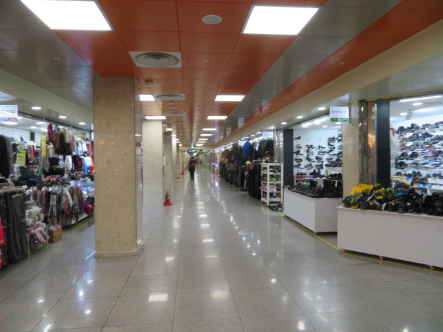 釜山地下鉄1号線の釜山駅に隣接している地下の商店街、KTXの釜山駅からもすぐの場所にあります、地下街ですので細長い通路の左右にお店が並んでいます、特に大きなお店はなく個人商店のようです、衣料品・雑貨店が多いです、安さを強調しているお店もあります、商品を眺めていると店員がそばに来ました、駅と商店街の間に休憩スペースがあります。