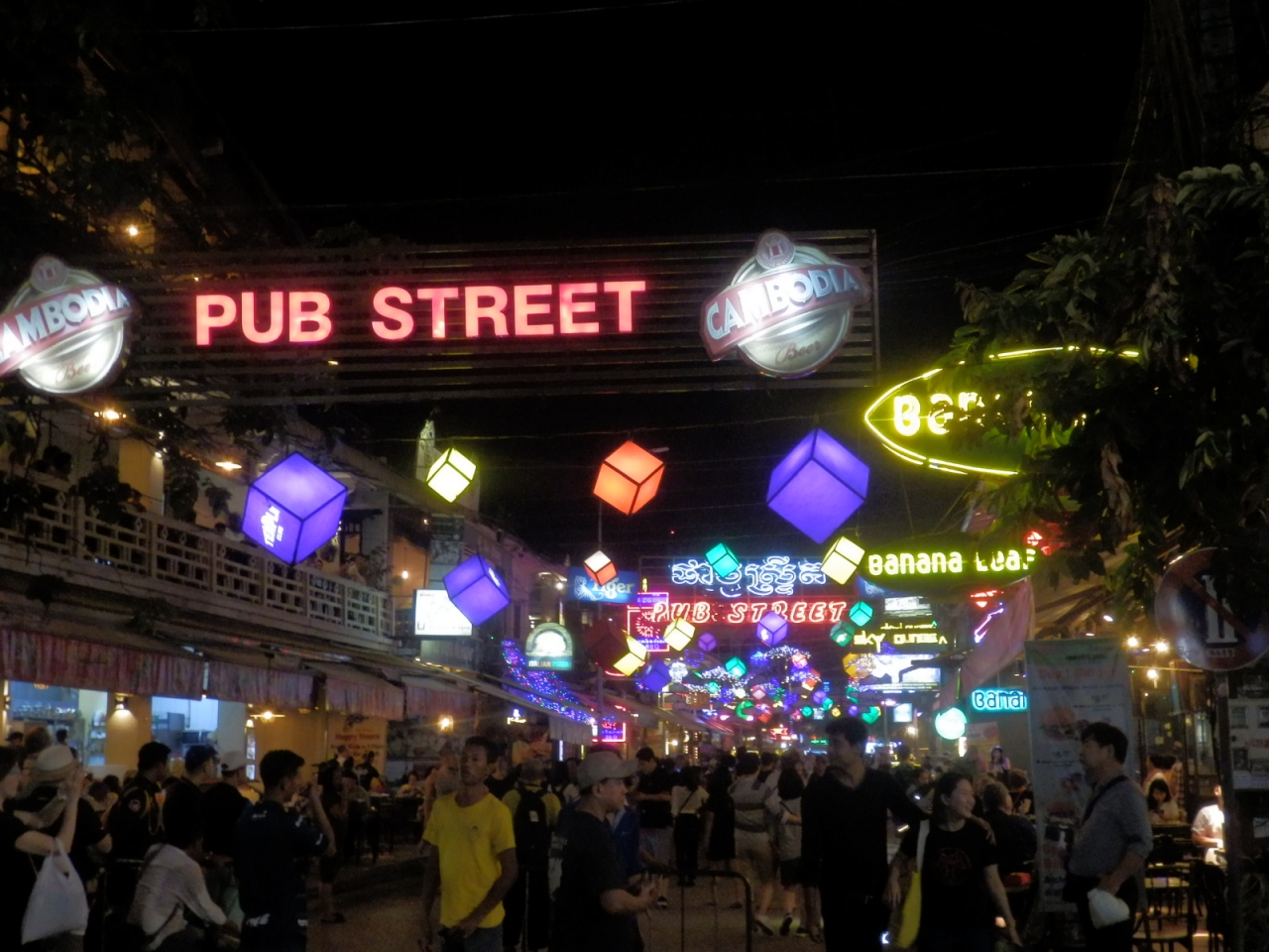 シェムリアップの夜の繁華街です。車両は通行止めになっていて、通りは観光客で溢れていました。通りの両側に並ぶのはオシャレなレストランで、大音量の音楽も流れてきました。通りから一歩入った細い路地にもオシャレなお店が多かったです。