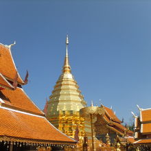 チェンマイの有名な寺院。少し遠いですが、チャーン・プァク門のソンテオ(赤色の乗り合いタクシー)乗り場に行けば行先も書いてあるので、自力でアクセスできます。ちなみにトラックの荷台で1000m近く上るのですが、乗り心地は悪いです。黄金のお寺ですが、天気も良くて青空だったので、黄金が映えた感じでした。周辺からの景色もよく、観光客も多かったです。