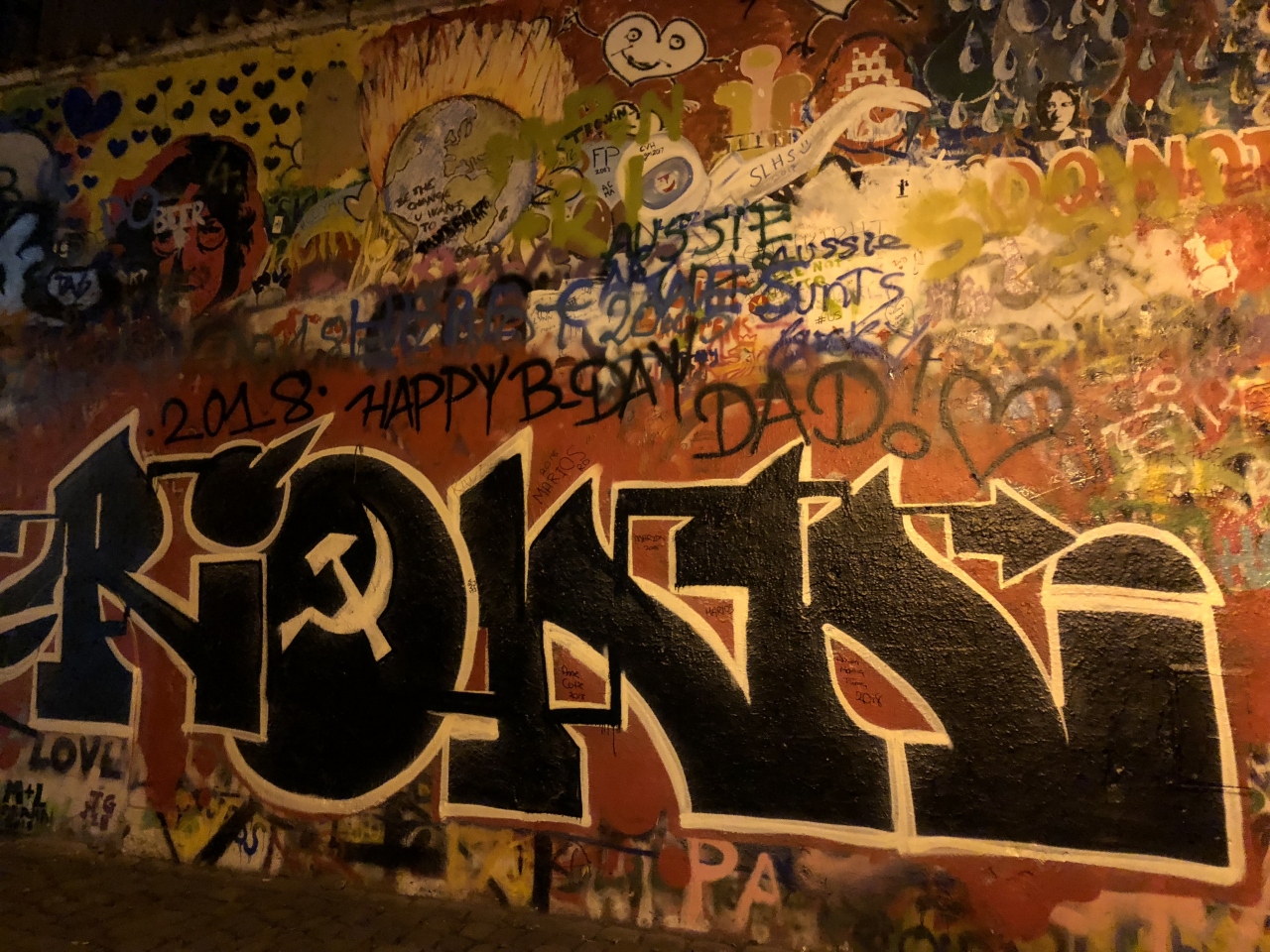 思ったより距離があり、日が暮れてから行ったせいか行くまでの道が暗くて寂しかったです。ジョンレノンのファンの人たちが書いたアートと言う名の落書きです。