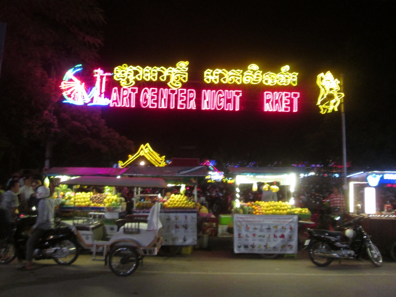 アンコールナイトマーケットやオールドマーケットといった中心市街地に寄り添うようにあるナイトマーケットです。オールドマーケットのある川沿いの向こう側にあり、オールドマーケットまで行けば、川の向うに輝くネオン看板があり、場所が分かります。途中、川に架かる橋がオールドチックでした。