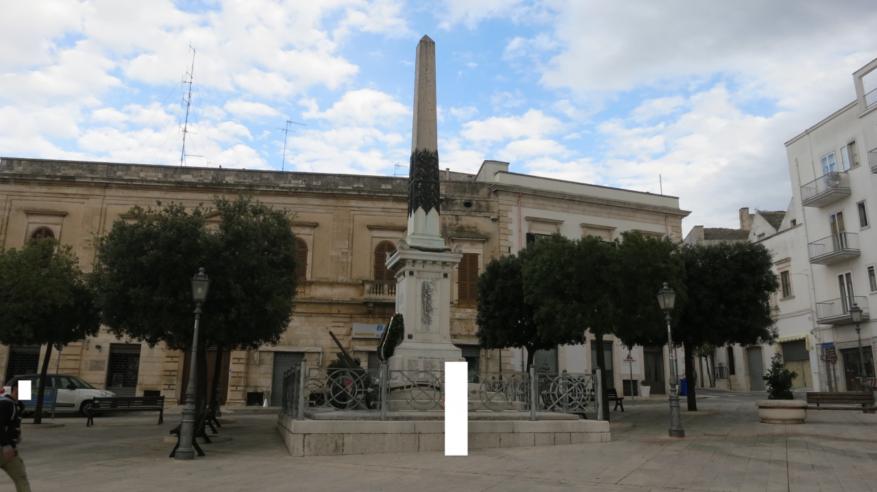 ポポロ広場の真ん中にオベリスクが設置されていました。このオベリスクは第二次世界大戦で戦士した人たちの慰霊碑だそうです。オベリスクのわきに大砲のモニュメントが置かれているのもそのためのようでした。ベンチがあり休憩場所として利用できそうでした。