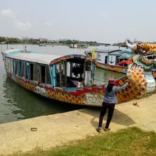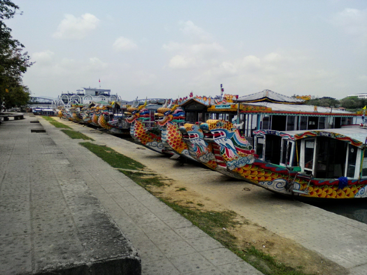 チャンティエン橋の下流側の遊歩道はドラゴンボートの船着き場になっていて歩いていれば必ず声をかけられます。クルーズの代表的なコースはティエンムー寺への往復1.5h(寺見学の待ち時間含む)。料金は1人20万ドンと言われることもありますが相場は15万ドンほどでしょうか。たまたま居合わせた旅行者とシェアすることもできるので、その場合は交渉すれば10万ドンにしてくれる場合もあります。さら交渉すればもっと安くなることもあります。船側は何人の場合でもさほど経費は変わらないのでそれを逆手にとれば有利に交渉できます。2人で16万ドンで乗ることができました。