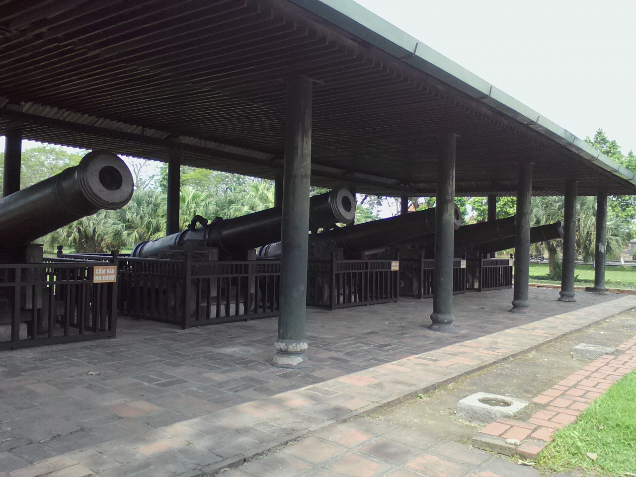 フラッグタワーを挟んだ両側に据えられています。ガン門側に4基、サップ門側に5基。ガン門側は観光バスの駐車場から王宮への通り道になっているので見学者が多く賑やか。それに比べサップ門側はひっそりとしています。根元側の砲尾部を見ると何やら弾痕のようなものが…。この大砲は実戦的なものではなく王宮を守る守護的な意味で造られたもののようです。弾痕はベトナム戦争当時のただの流れ弾でしょうか?