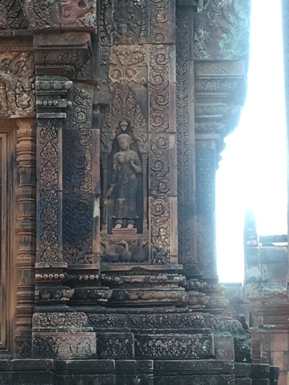 10世紀後半に建てられた女の塔という意味の寺院だそうです。赤い砂岩やレンガでできた赤い寺院。シェムリアップから車で1時間位のところにあり、アンコールワットやアンコールトムとは全く違う雰囲気です。数あるレリーフの中でも中央祠堂の内側に彫られたデヴァターが有名なので行ってきました。