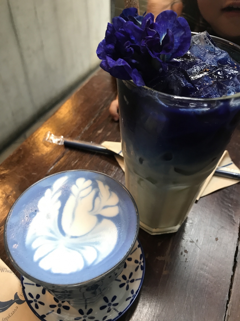 アジアで人気のハーブのお茶バタフライピー抗酸化作用があり、アンチエイジング効果が高いのラテ(アート付き)が売りのお店。味は結構甘く、ピーというだけあって、豆っぽい味がしました。見た目はとても可愛いです。