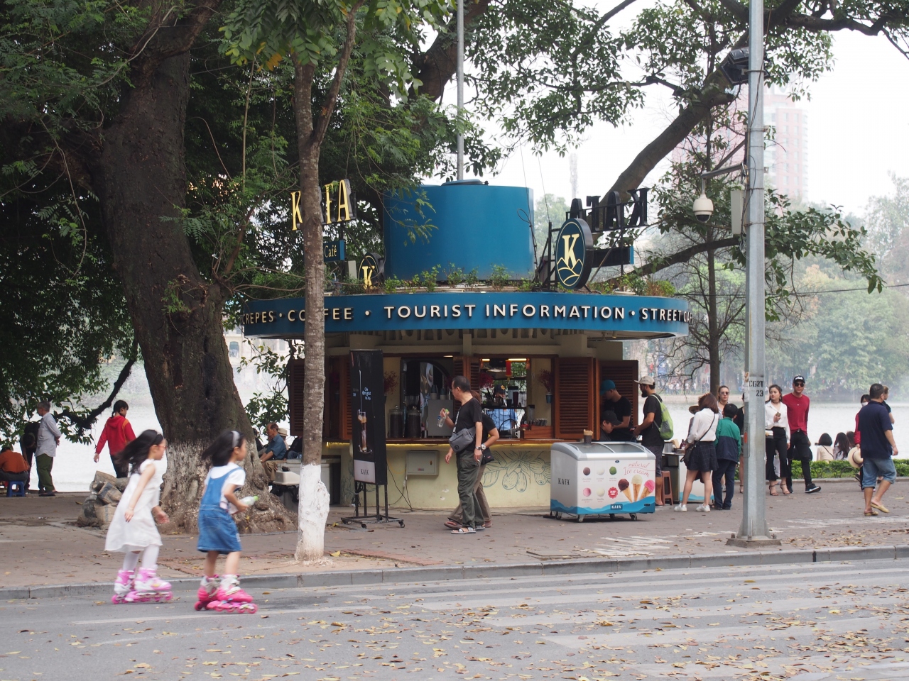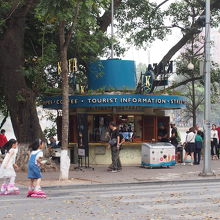 ホアンキエム湖の東側の湖岸を歩いていると、移動式のブースのような観光案内所がありました。ハノイ市の観光案内所のようです。地図、パンフレットが手に入ります。特に相談することもなかったのですが、見ていると訪れている観光客も結構いるようです。
