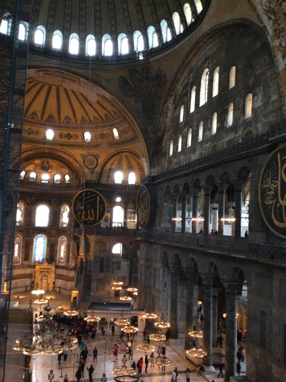 ブルーモスクで写真を撮り、その後すぐ近くのアヤソフィアへ。まず、行列。入場券のない人の行列もすごいが、入場券を持っている我々でもかなり並ぶ。セキュリティー検査を受けるので時間がかかるのか?アヤソフィアのすごいのは、ビザンチンのギリシャ正教で始まった後、モスクにかえられても、まだ私たちがビザンチン時代のモザイク画が見られるところ。よくぞ残してくれたと感謝。