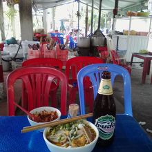 夜になると何軒もバンカン屋が開くようです。お昼の12時頃に行きましたが2軒開いていました。Dinh Tien Hoang通りに近い側に1軒と中ほどに1軒。値段を聞くと前者は2万ドンで後者は1万5000ドン。安い方でよかったので中ほどの店で注文したら大きな骨付き豚肉をゴロンと丼に入れそうになったのでそれいらないから1万ドンでいい?と聞くとokになりました。具材としてははんぺん、ハム、つみれ、ウズラの卵ですが昼食に軽く食べるにはこれで十分。味もおいしいです。通りにある小さな商店で冷えたフーダビール(1万ドン、要びん返却)も買えます。旧市街で簡単に食事を済ませたい方にはおすすめです。