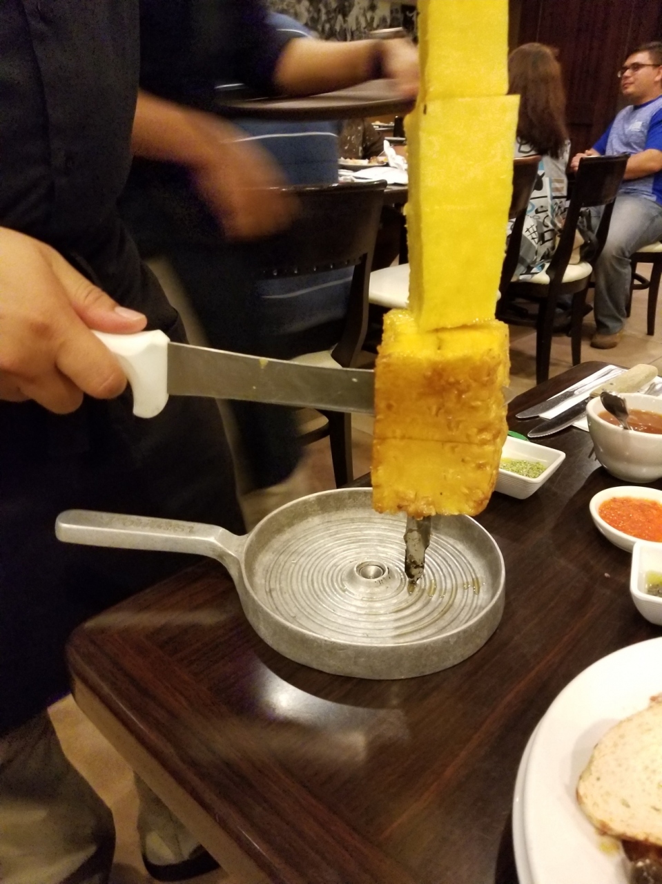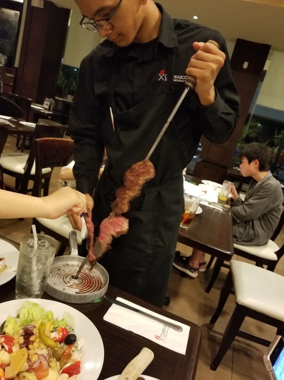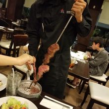 シェラスコ食べ放題のお店です。前菜とお料理、フルーツがビュッフェ形式で頂けます。店内を焼きたてのお肉を持って回ってきてくれます。チキン、ビーフ、ポーク、パイナップルなどがあり、ボリューム満点です! 数種類のソースがありバリエーションを変えてたくさん頂けます。