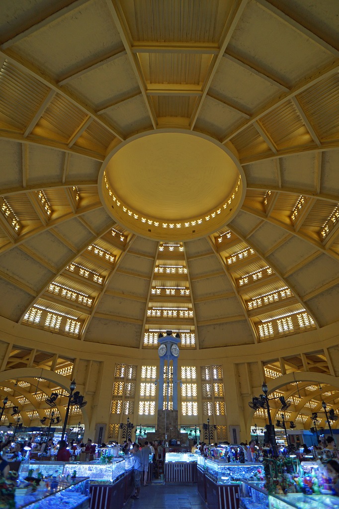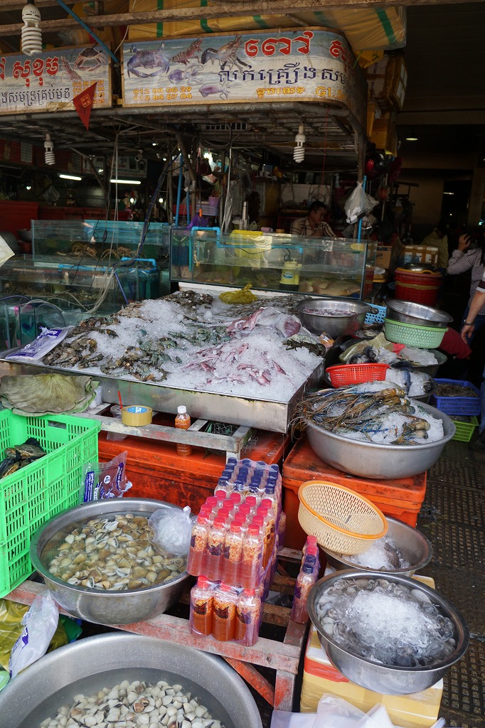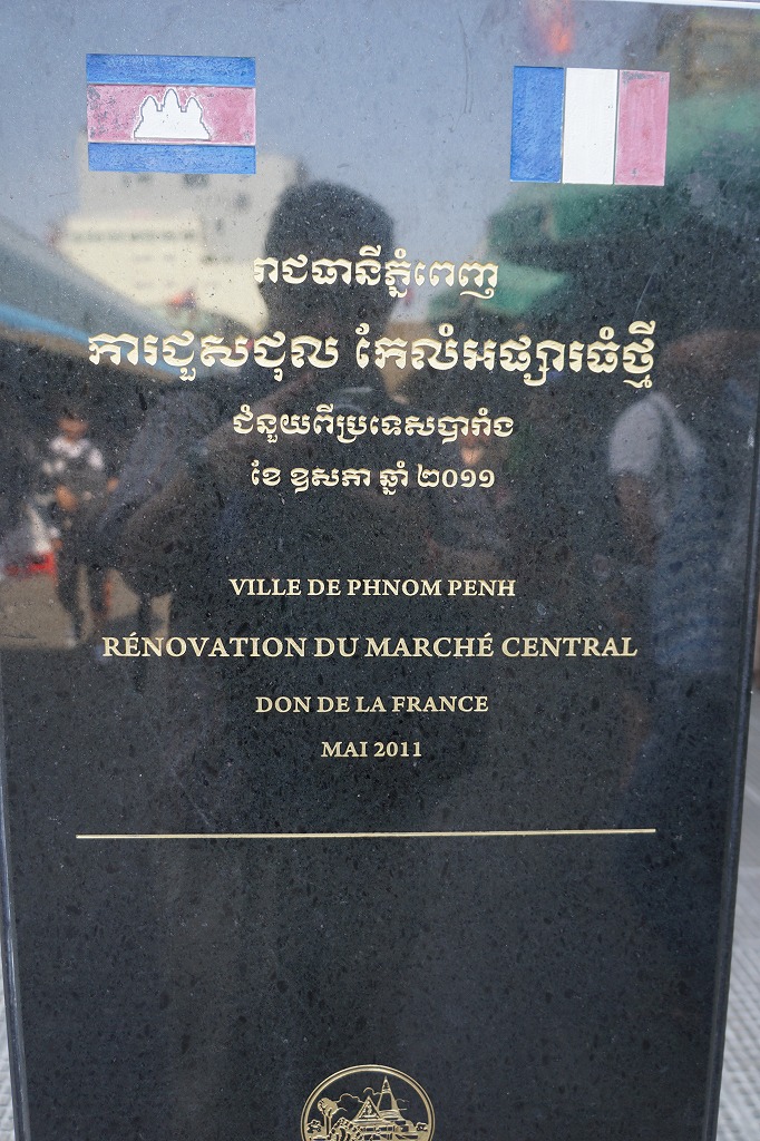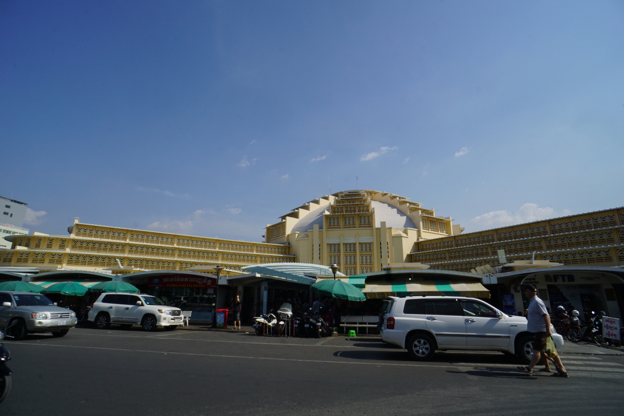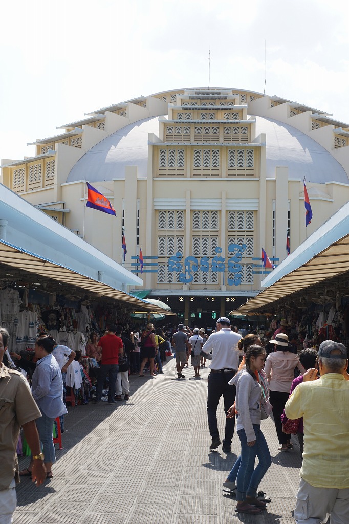 ツアーの日程に組み込まれていたので1時間しか滞在できませんでした。ここでの買い物はあまり期待していなかったのですが、Tシャツやお土産に良さそうなクロマーが安い値段で売っています。当然手織りか機械織りかで値段は違いますがシュムリアップのマーケットと同じくらいの金額まで交渉できます。Tシャツは最初の言い値が3ドル、2ドルまでは簡単に下がりますがそれ以上は枚数を買わないと下がらないでしょう。品質はまちまちですが、18年前に1ドルで買った地雷注意のTシャツはとても丈夫で今回も着てきました。クロマーは機械織の小さいサイズが2ドルですが、5枚買えば1枚は最低でも負けてくれます。大きいサイズは3ドルですが4枚で10ドルにはなります。後は合わせて値段交渉できると思います。マーケットの正面入り口(看板が入口に掲げられている)が東側になりますが、この入り口の左にあるシルバー屋さんでは気持ち良い買い物が出来ました。前の日の夕方にラッフルズ・ホテルのエレファント・バーのテーブルに置かれた象のキャンドルスタンドが気に入っていたのですがこの店で見つけることが出来ました。ただ値段が1個57ドルでペアで114ドル。時間が無かったので「最終値段を提示して。」というと「90ドル。」と渋い顔をされました。帰国前で現金が60ドルしかなく「二人合わせて60ドルしかない。これから空港に行って日本に帰るんで。」というと一転笑顔になって「日本人なら早く言ってよ。日本はプノンペンに橋を作ってくれた友好国なんだから。」ということで約半額にしてもらえました。値段が下がったことも嬉しいですが、それ以上の買い物ができた気がします。