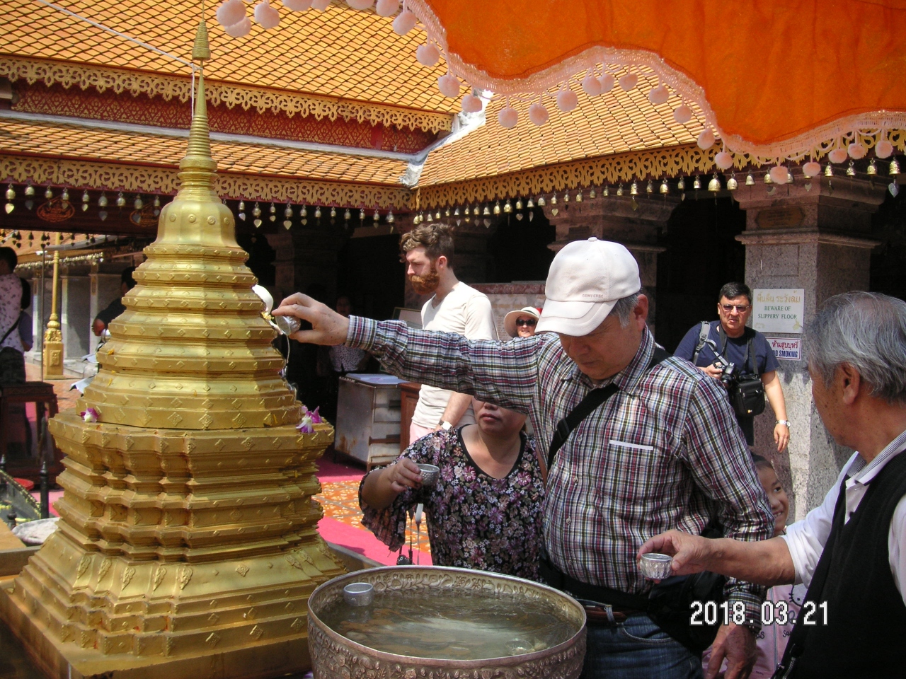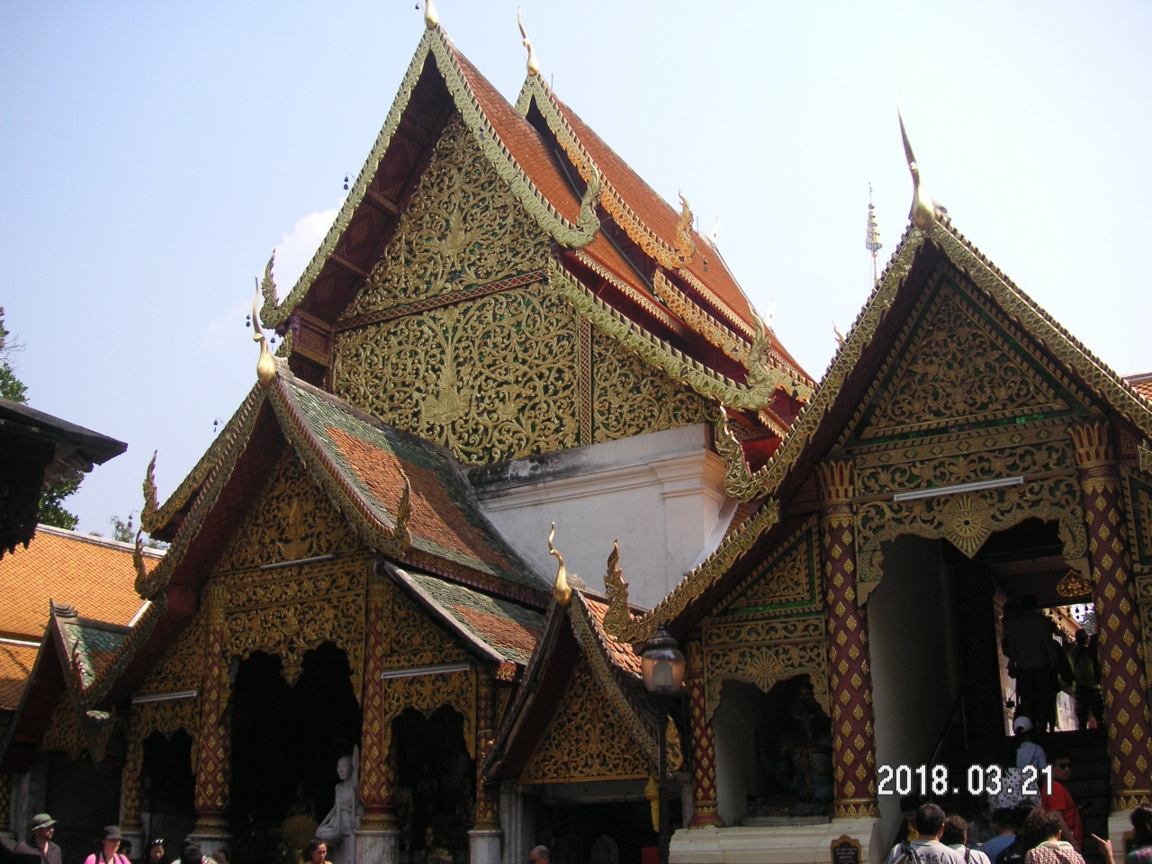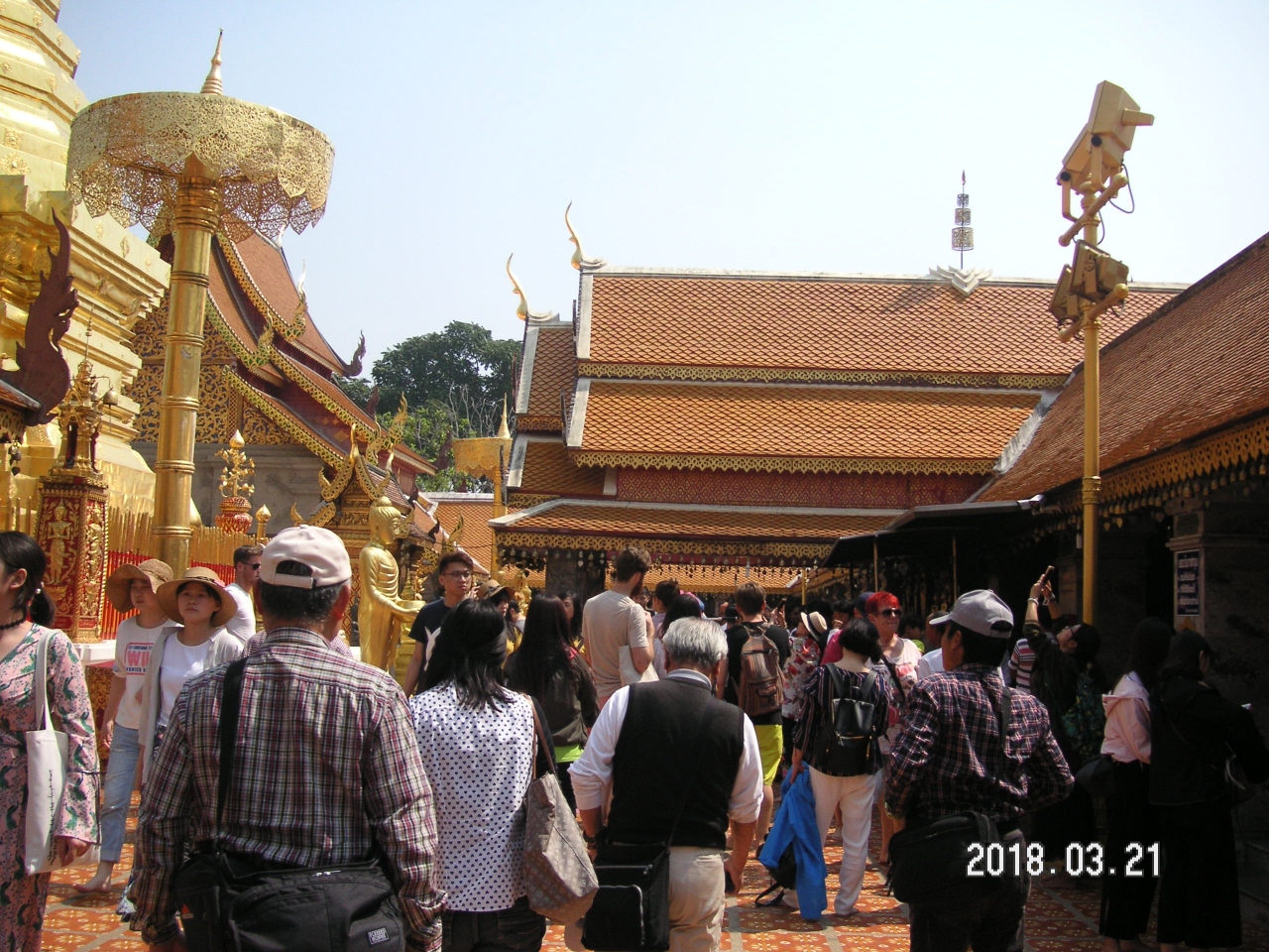 3年半前には日本語ガイド付きで一人で観光に来たが、今回は4人でチェンマイ観光の初日で、永遠と山の上まで来て、斜行エレベータで寺院に上り、ガイドに案内されて綺麗な寺院を参拝した。入り口の大きな木の実が目を引いた。