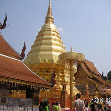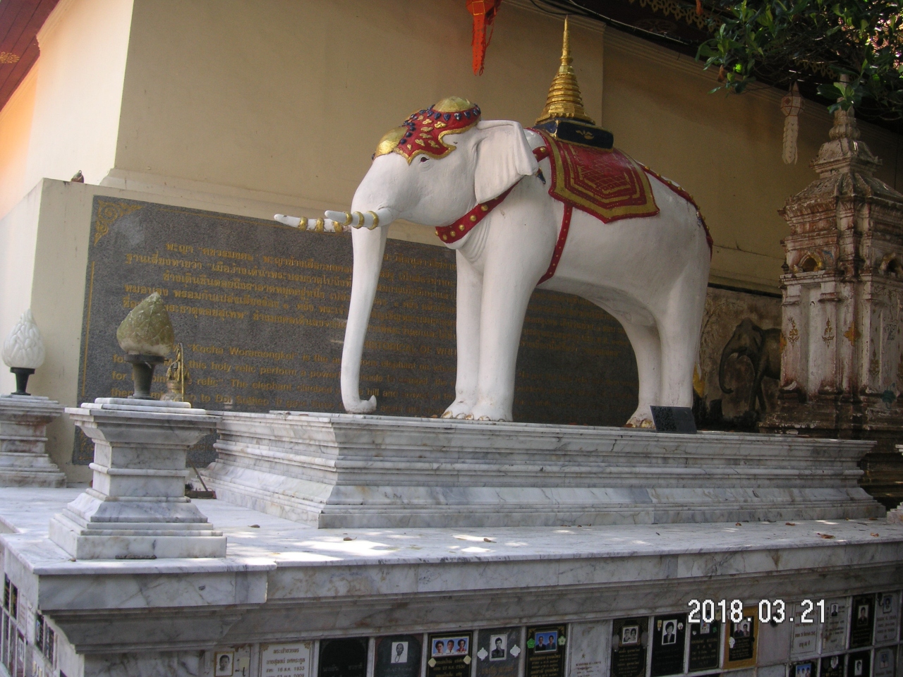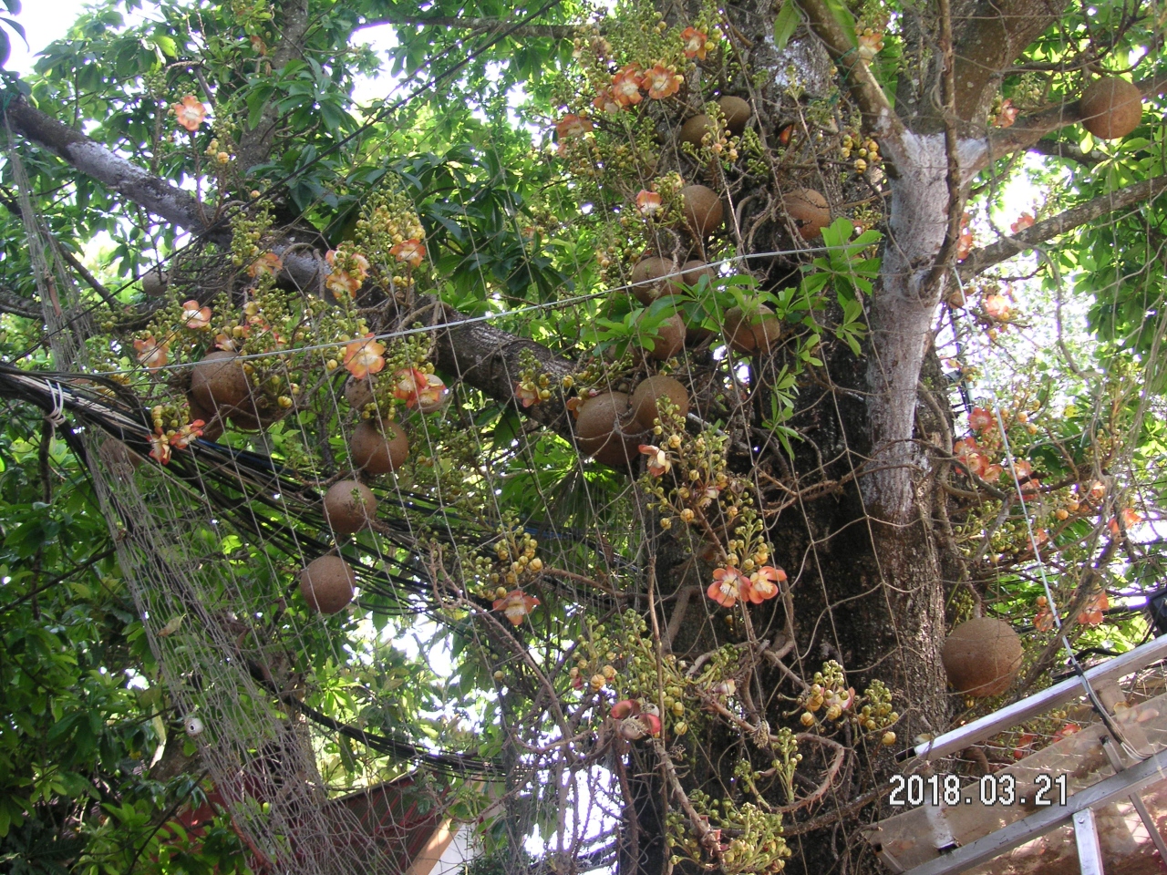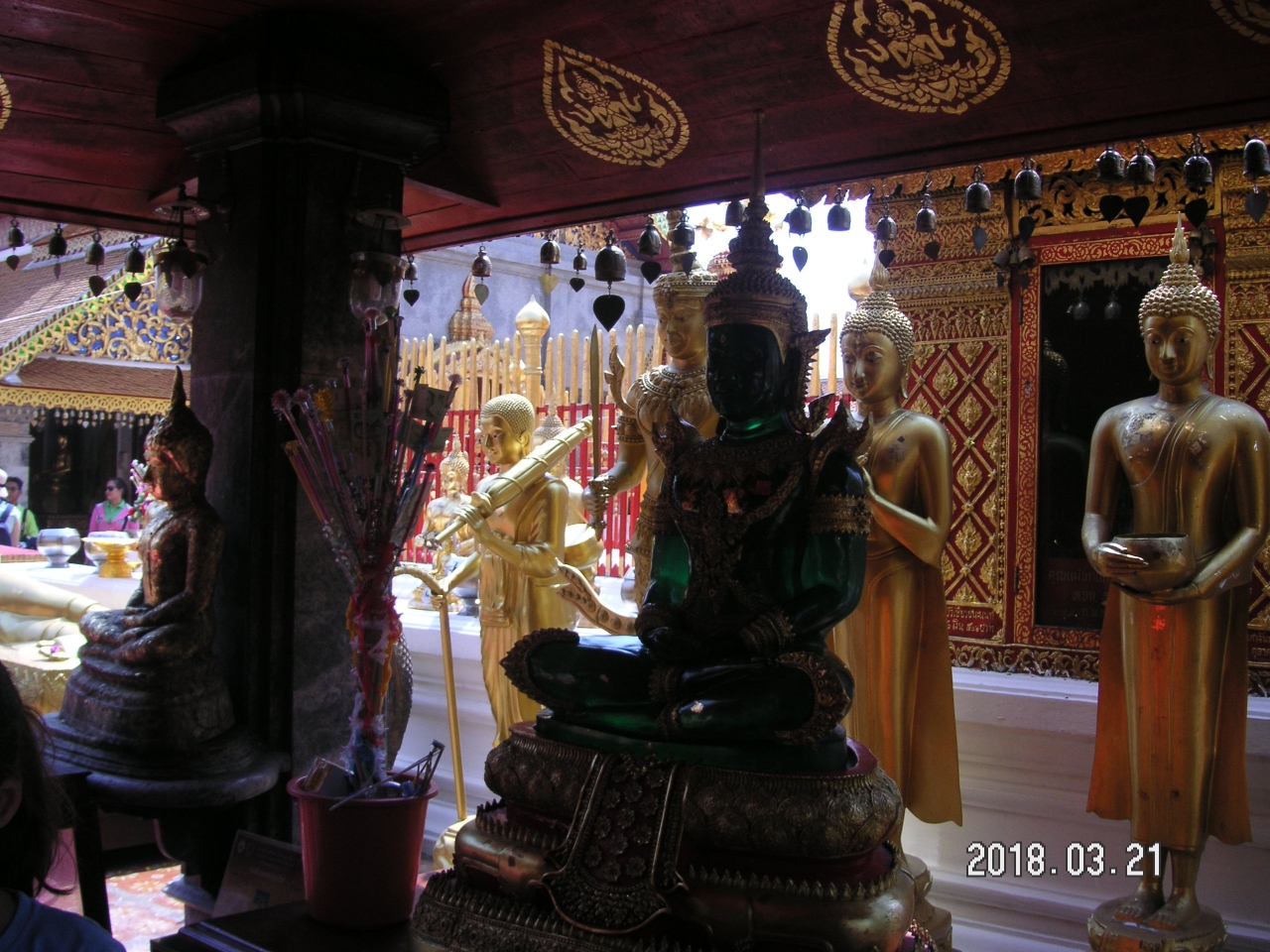 3年半前には日本語ガイド付きで一人で観光に来たが、今回は4人でチェンマイ観光の初日で、永遠と山の上まで来て、斜行エレベータで寺院に上り、ガイドに案内されて綺麗な寺院を参拝した。入り口の大きな木の実が目を引いた。