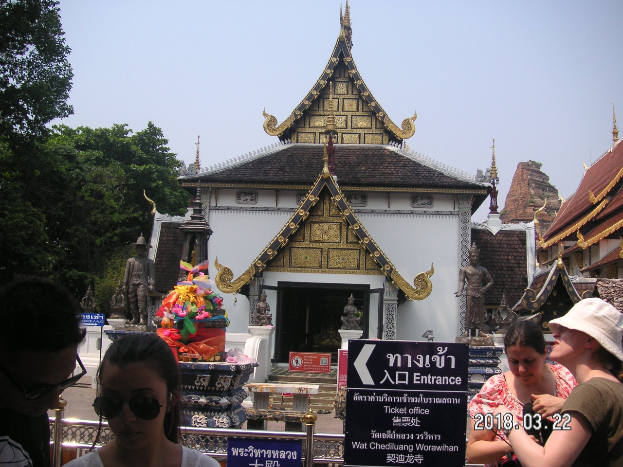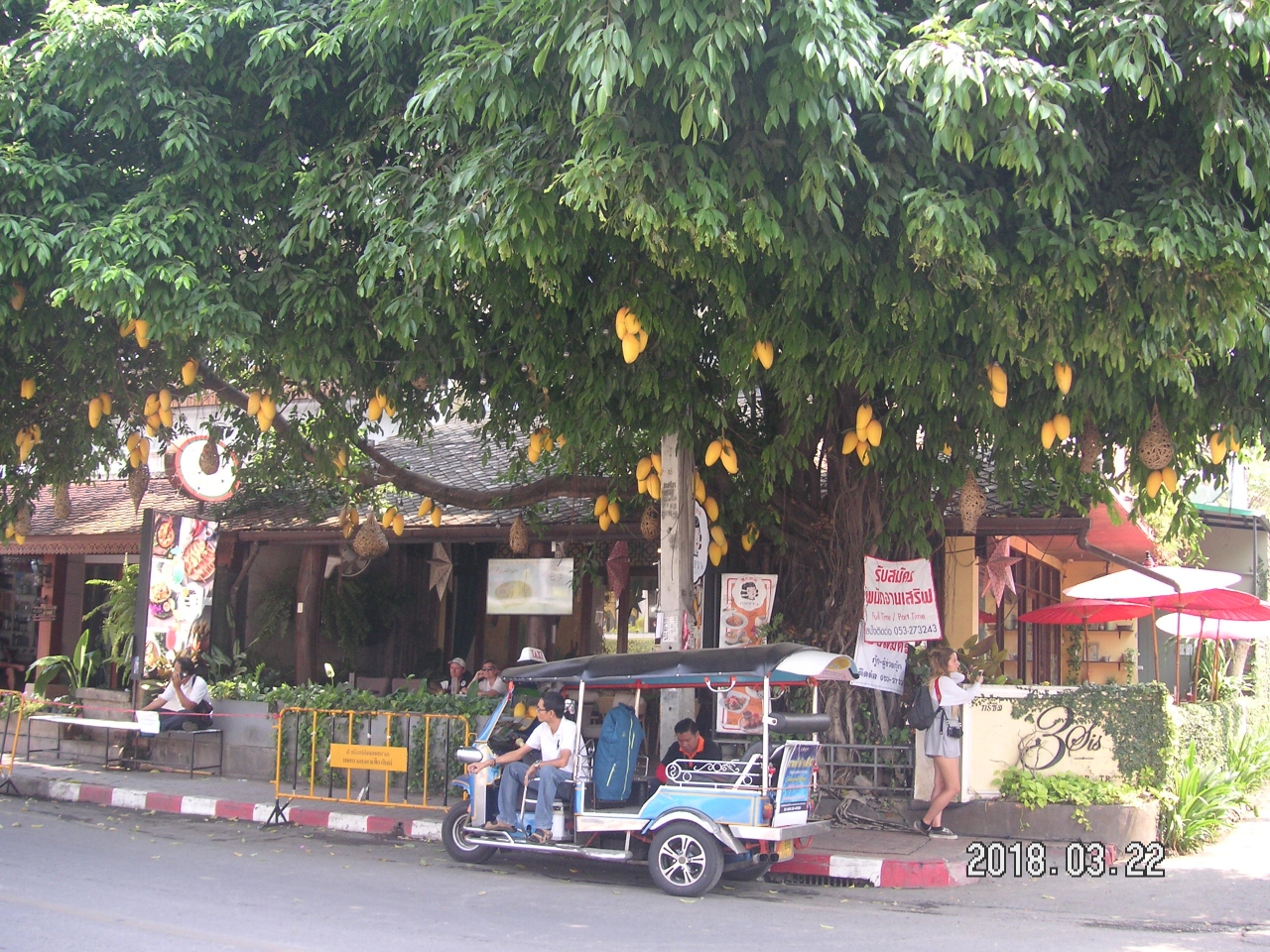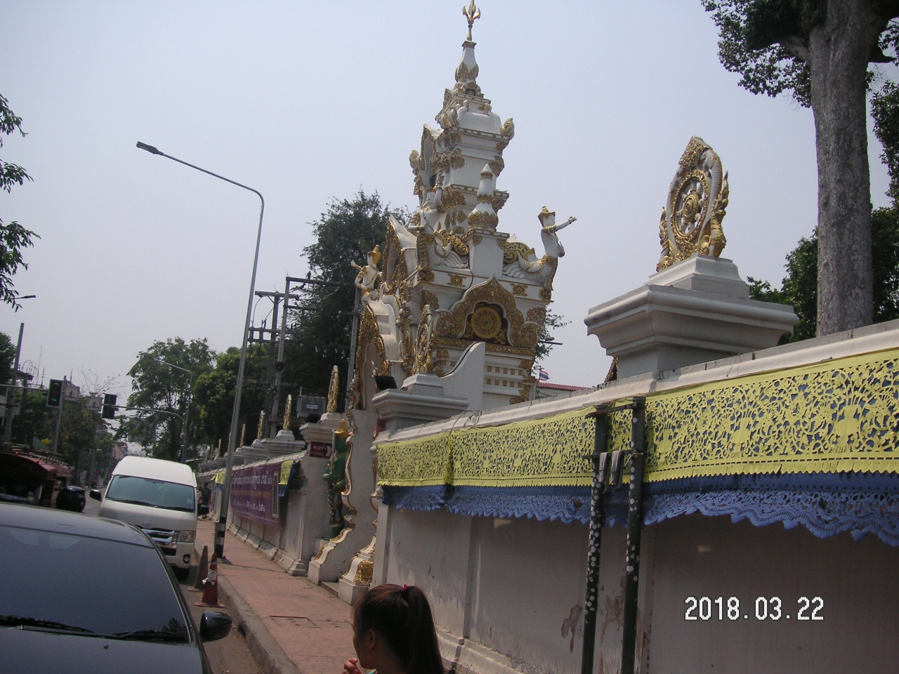 チェンマイ初日の宿泊の翌日4人グループ出3人はゴルフに行ったが、自分はゴルフが苦手なので、ホテルから近場の寺院に一人で徒歩で観光することにした。4箇所目がチェンマイの寺院でも敷地に入るのが有料であった。この施設の道路の反対側の街路樹に大きな木に黄色い果物が無数になっていたのが目を引いた。本堂の背後にそびえるレンガ造りの大仏塔が有名とのこと。人影はまばらであった。