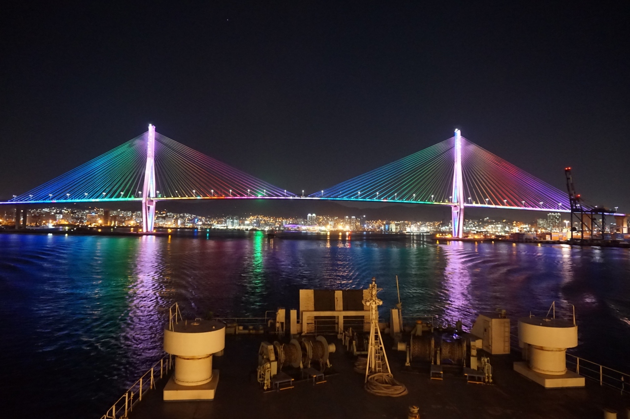 釜山港に入港する船ならば、必ずくぐる釜山港大橋。山の高い場所まで林立する高層マンション群や、ターミナルにひしめくコンテナとともに、強く印象に残る風景の1つになっています。