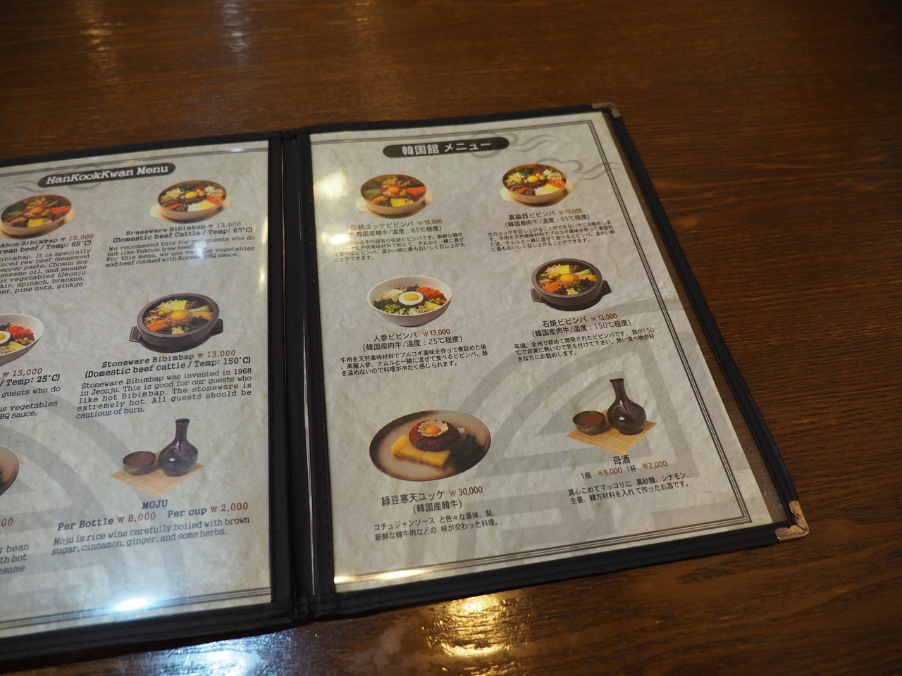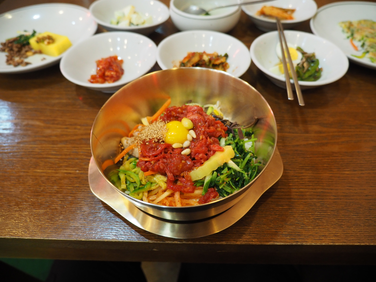 ユッケビビンバに15,000ウォンは高すぎる!と思いましたが、パンチャンにキムチはもちろん、チヂミに名物の緑豆寒天も出てきて、結果大満足です。日本では食べられなくなったユッケも乗っていて、とても美味しかったです。