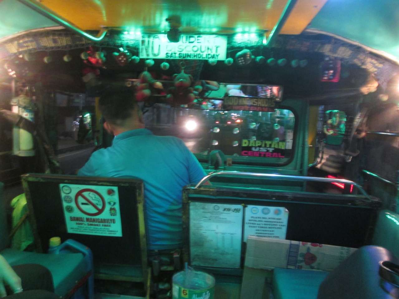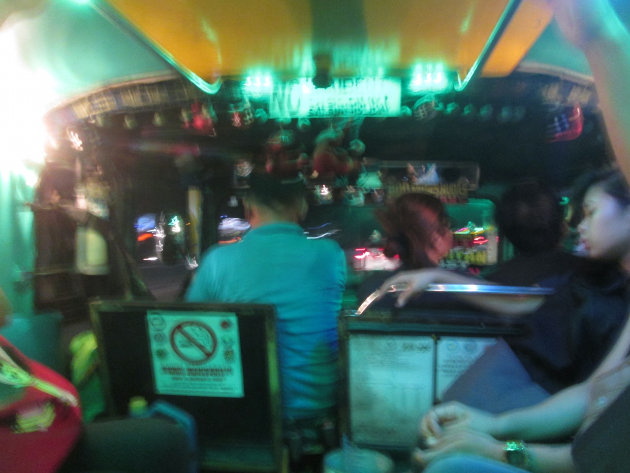 内装が凝ったジプニーを見かけました。車内はきれいな照明を使っており明るく、運転手と乗客の間にかわいくて小さいぬいぐるみが釣ってありました。乗車する際、行き先を聞いたとき運転手は何となく丁寧に対応してくれたので、その性格を表すような車内でした。乗車中、車内の凝った内装を眺め続けました。