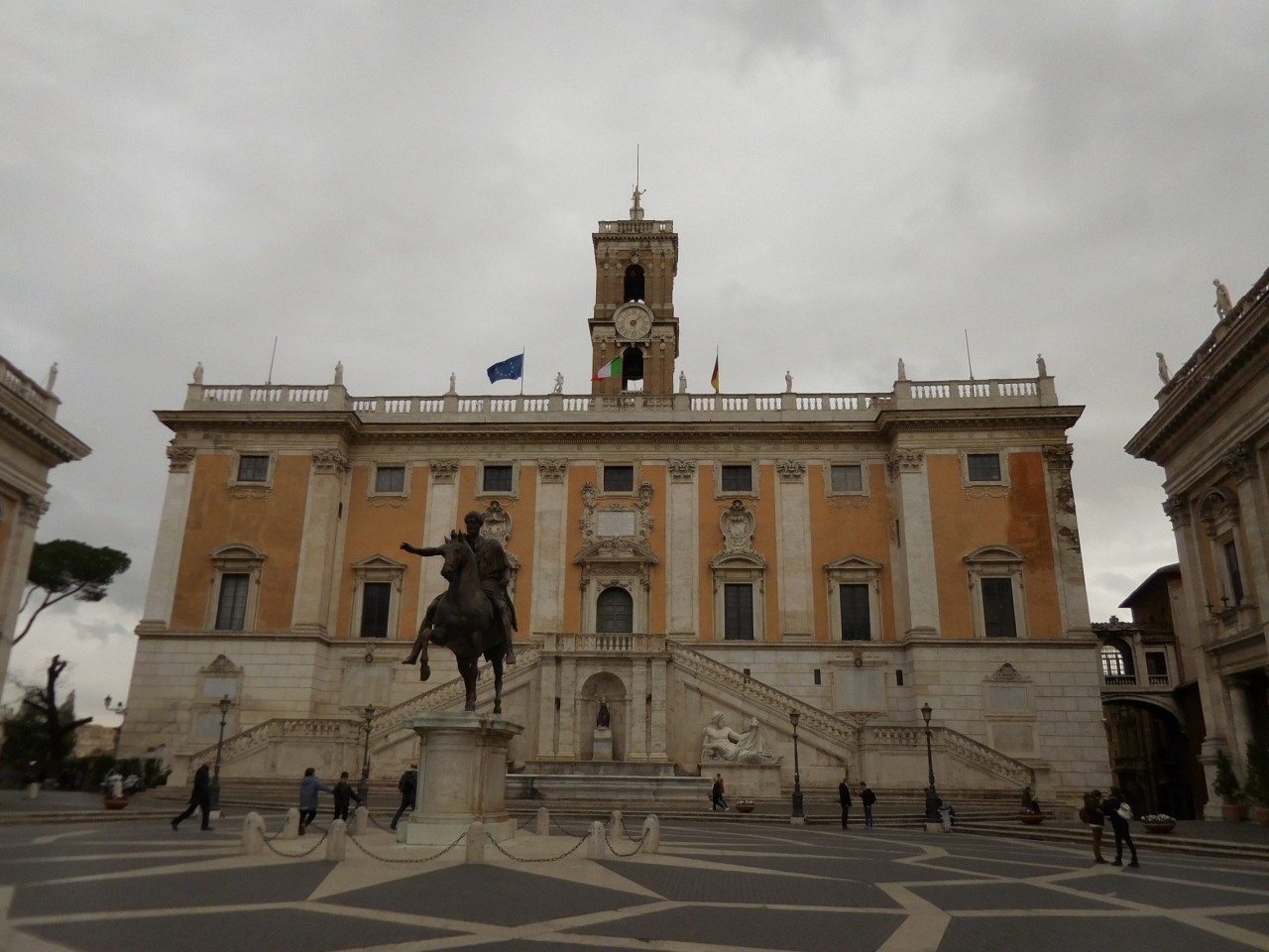 ヴィットーリオ・エマヌエーレ2世記念堂正面から右側に回り込むと入口がありますが、私は左側から坂道を登って行きました。フォロ・ロマーノを眺めながら坂をのぼりきったところに広場はあります。広場正面の市庁舎のテラスから見たフォロ・ロマーノは絶景でした。