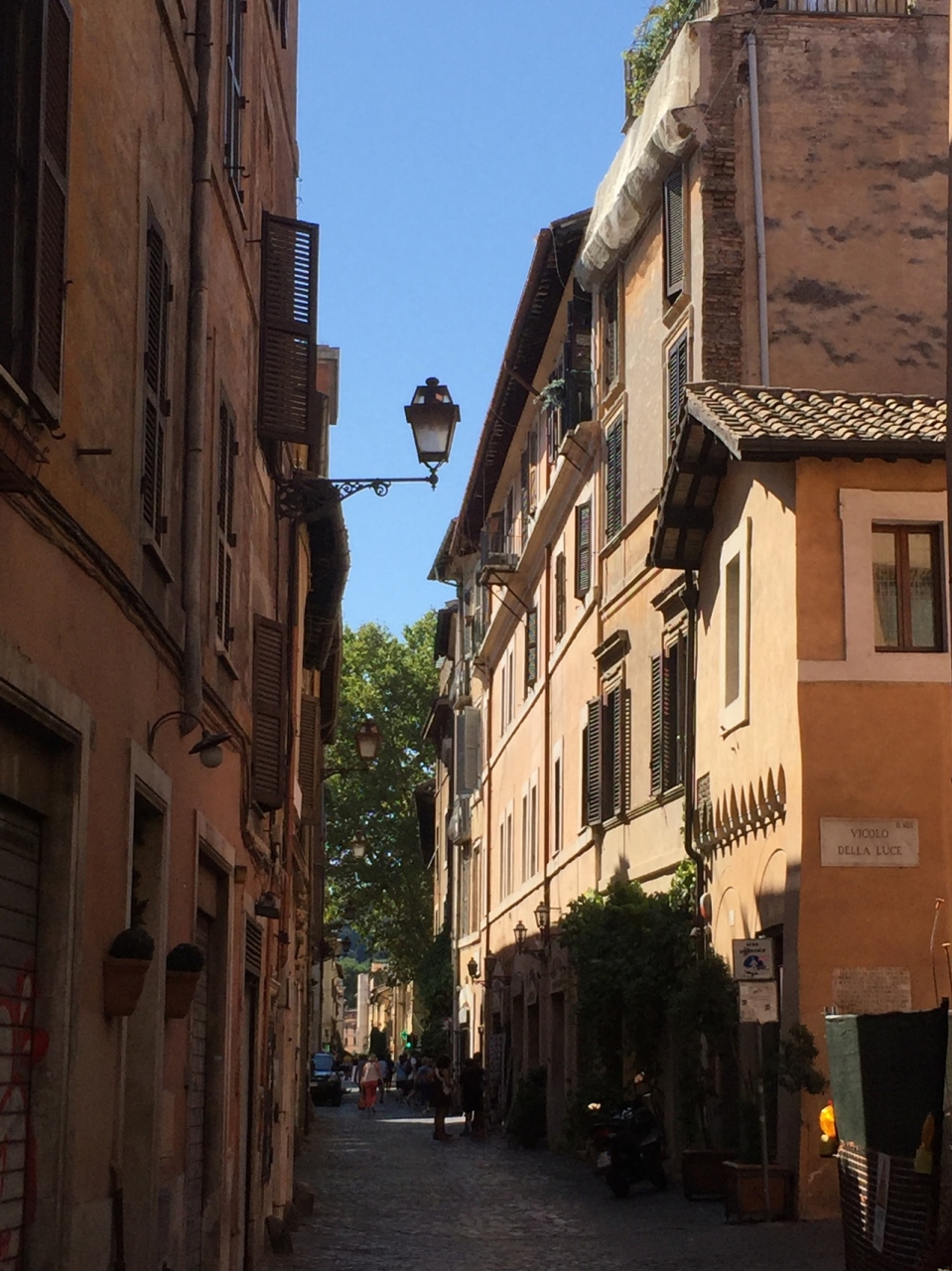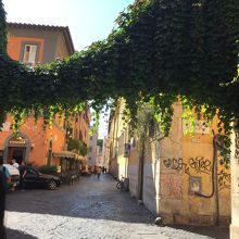 テヴェレ川の反対側という意味の地名で、下町的なエリアです。残念ながら、昼間に散策しましたが、本来は夜が活気溢れていて、良いようです。それでも、細い路地や建物の佇まいが気持ちよく、居心地もいい場所です。夕方前でしたが、散策終わりにはワインを飲むことも出来ました。