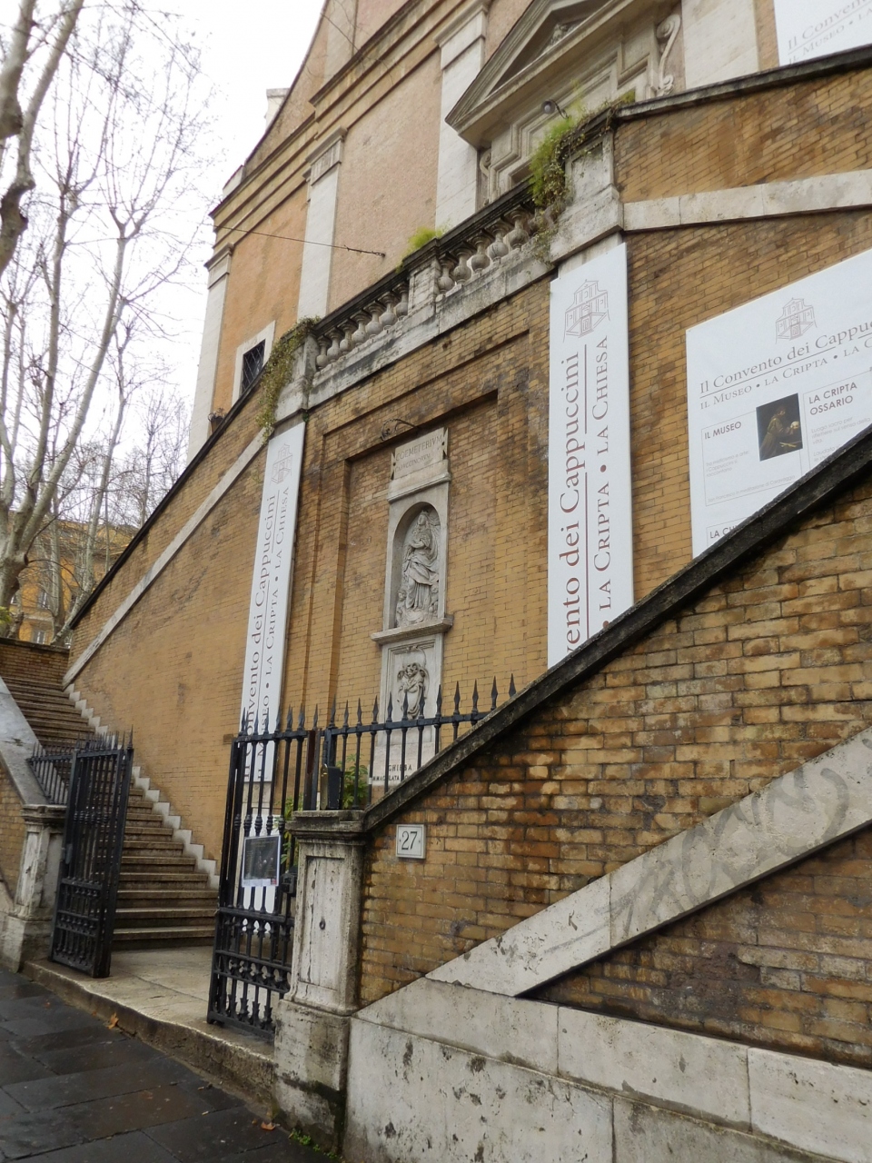 バルベリーニ広場から蜂の噴水のある坂道を登るとすぐに右手に見えてきます。入場料が8.5ユーロでした。ここは教会ではなくて教会の建物を利用した博物館なので仕方がないですね。みどころはやはり4000体もの修道僧の遺骨を使って飾られた5つの地下の堂ですが、残念ながら館内写真撮影禁止でした。お土産売り場で写真を買って帰りましょう。