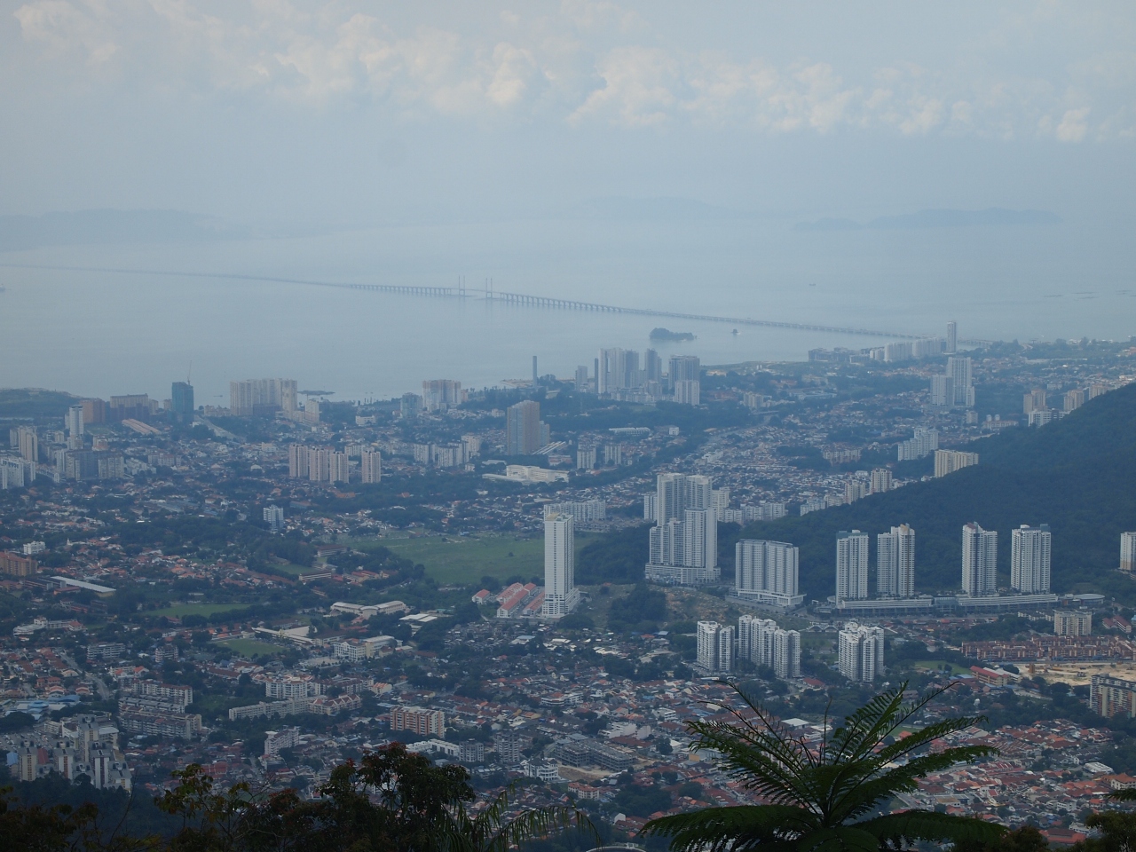 ジョージタウンの街並みと海を見下ろす丘。ペナンブリッジや対岸も見えます。