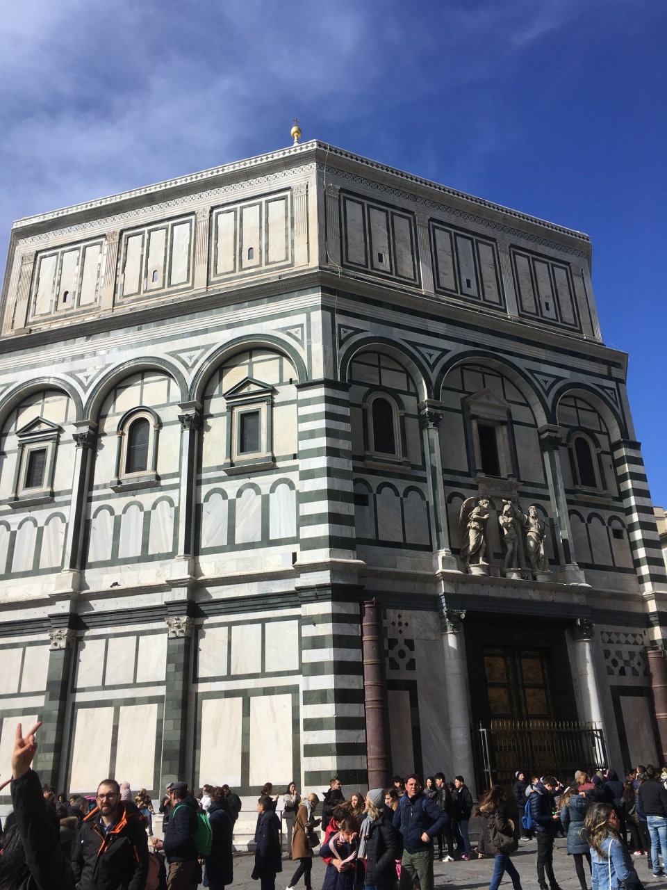 ドゥオーモとジョットの鐘楼、そしてこのサン・ジョヴァンニ洗礼堂の3つの建築物で構成されているのがサンタ・マリア・デル・フィオーレ大聖堂です。3つともに世界遺産フィレンツェの歴史地区の一部として指定されています。洗礼堂にある第3の扉「天国の門」は、旧約聖書に登場する有名な場面をモチーフにした、ロレンツォギベルティ作の10枚のブロンズ彫刻パネルです。このパネルはレプリカでオリジナルはドゥオモ博物館に展示されています。