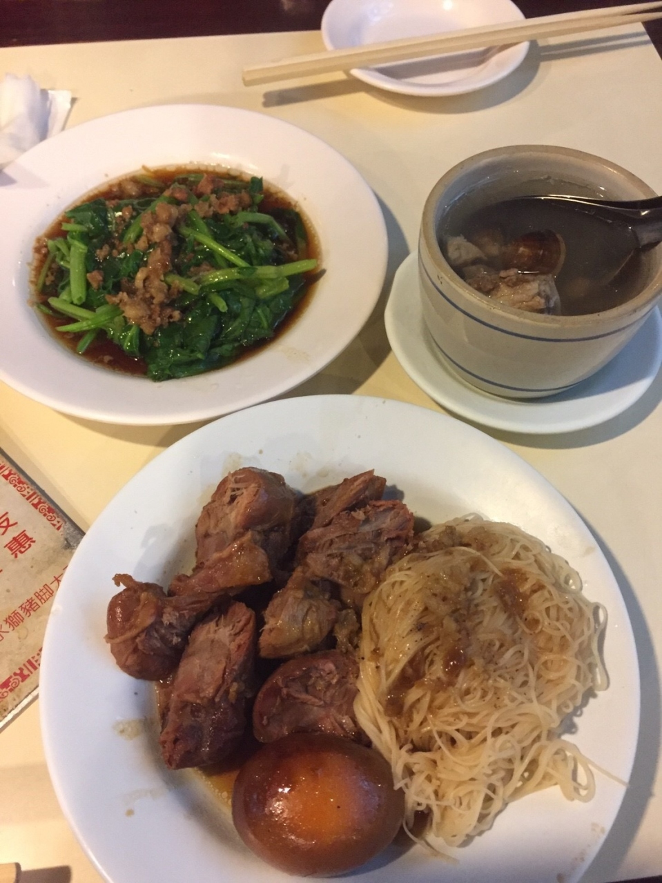 日曜の夜だったので売り切れの肉もありました。店内は広くテーブルも立派。メニューは写真付きで分かりやすかったです。痩肉と素麺と煮卵のセットを頼みました。お肉はボリュームがあり日本人好みの味だと思います。素麺は油をまぶしてあり、その上からタレがかかっています。最低消費金額があったと思うので一人だとキツイかな。