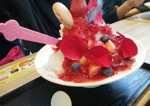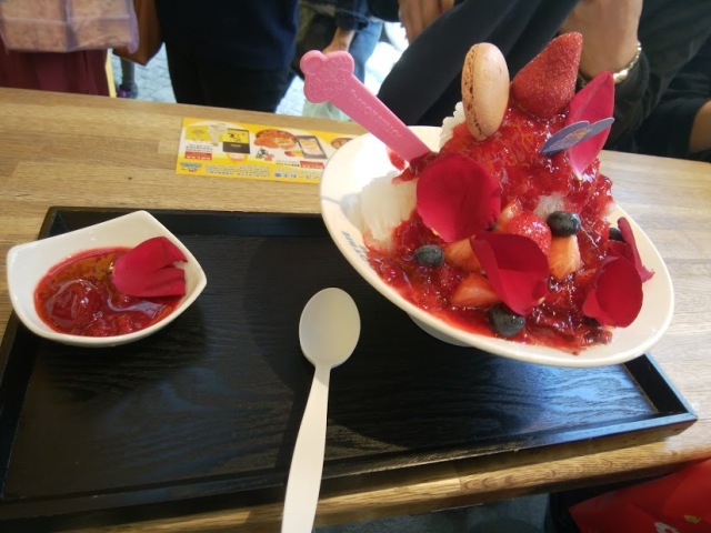 3月初旬でマンゴーの季節ではなかったので「NEW」と書かれた新商品らしきイチゴにバラの花びらトッピングしてるかき氷を二人で一つオーダーしました。