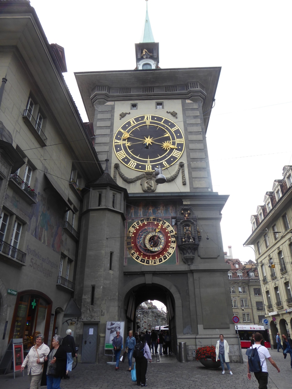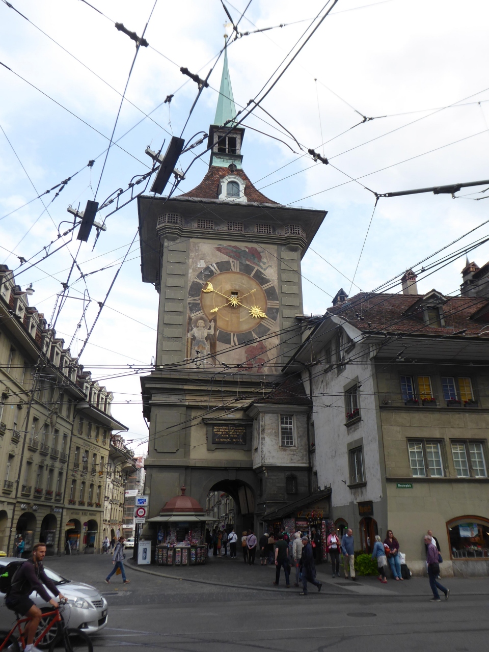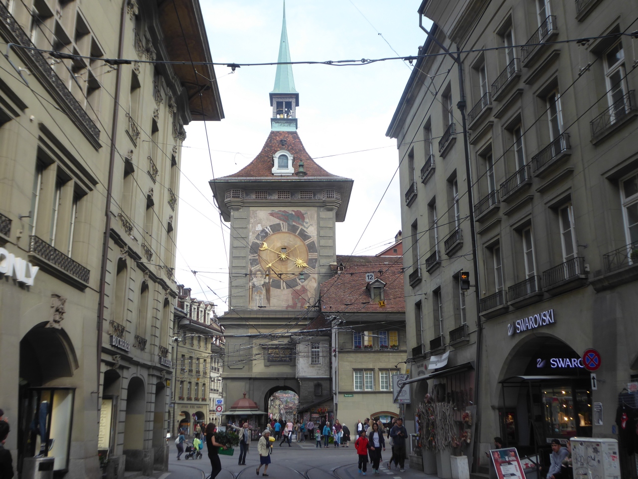 マルクト通りを更に進むと、牢獄塔と似た形ですが中央部に大きな時計のある塔が見えてきました。時計塔(Zytglogge)で、1191年に建設されたスイスで最も古い時計塔の1つだそうです。見事な時計塔です。12世紀のベルンは裕福で、工業技術も進んでいたことが想像されます。