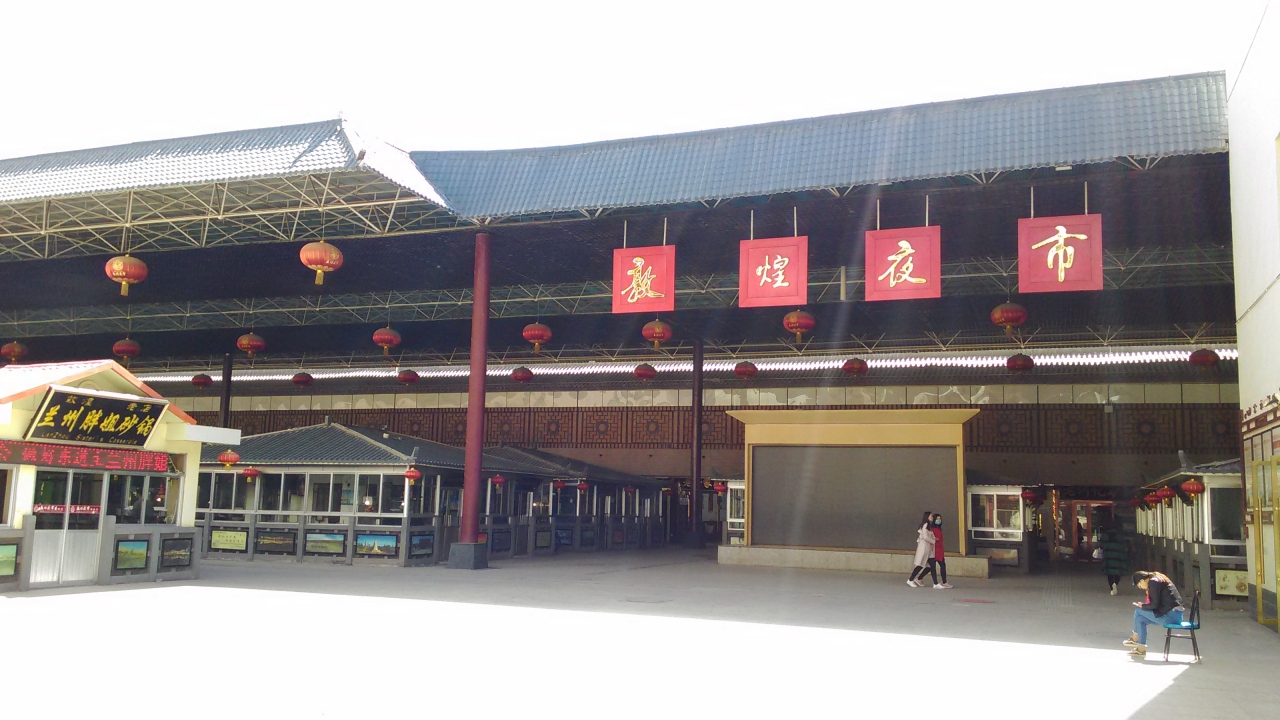 敦煌滞在中の莫高窟、鳴沙山に並ぶ必須スポット?ですね。夏場、6月から8月のハイシーズンは広場と歩行街の部分が屋外ビアガーデンになり、雰囲気抜群になります。ただし、5月ぐらいまで夜は寒いのでテーブルは出ず、営業もプレハブ小屋の屋内店舗のみになります。