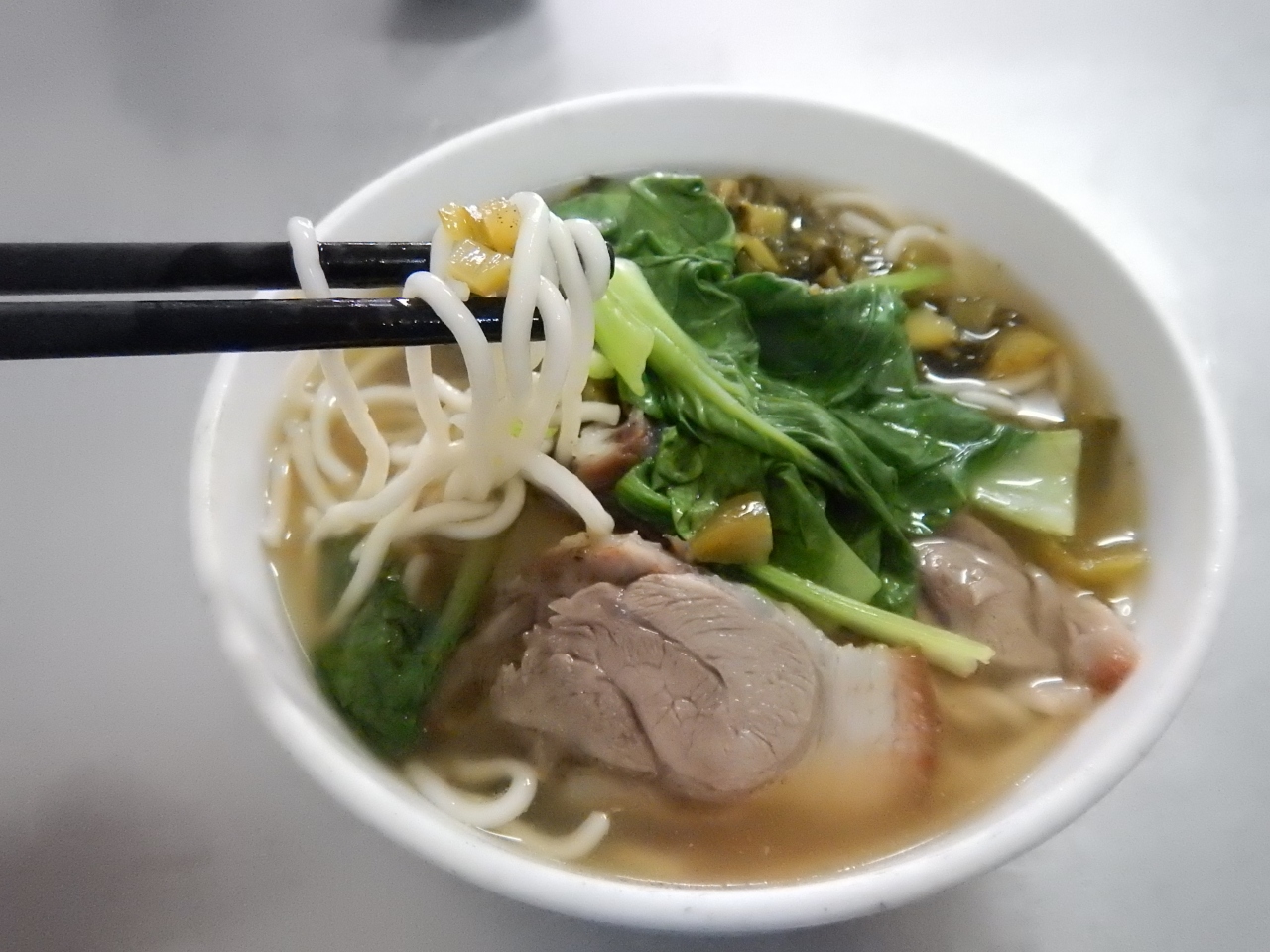 この日はポークヌードルを食べた。厚めの豚肉と空芯菜が入っていた。麺は柔らかめだ。代金は普通盛りで2$だった。