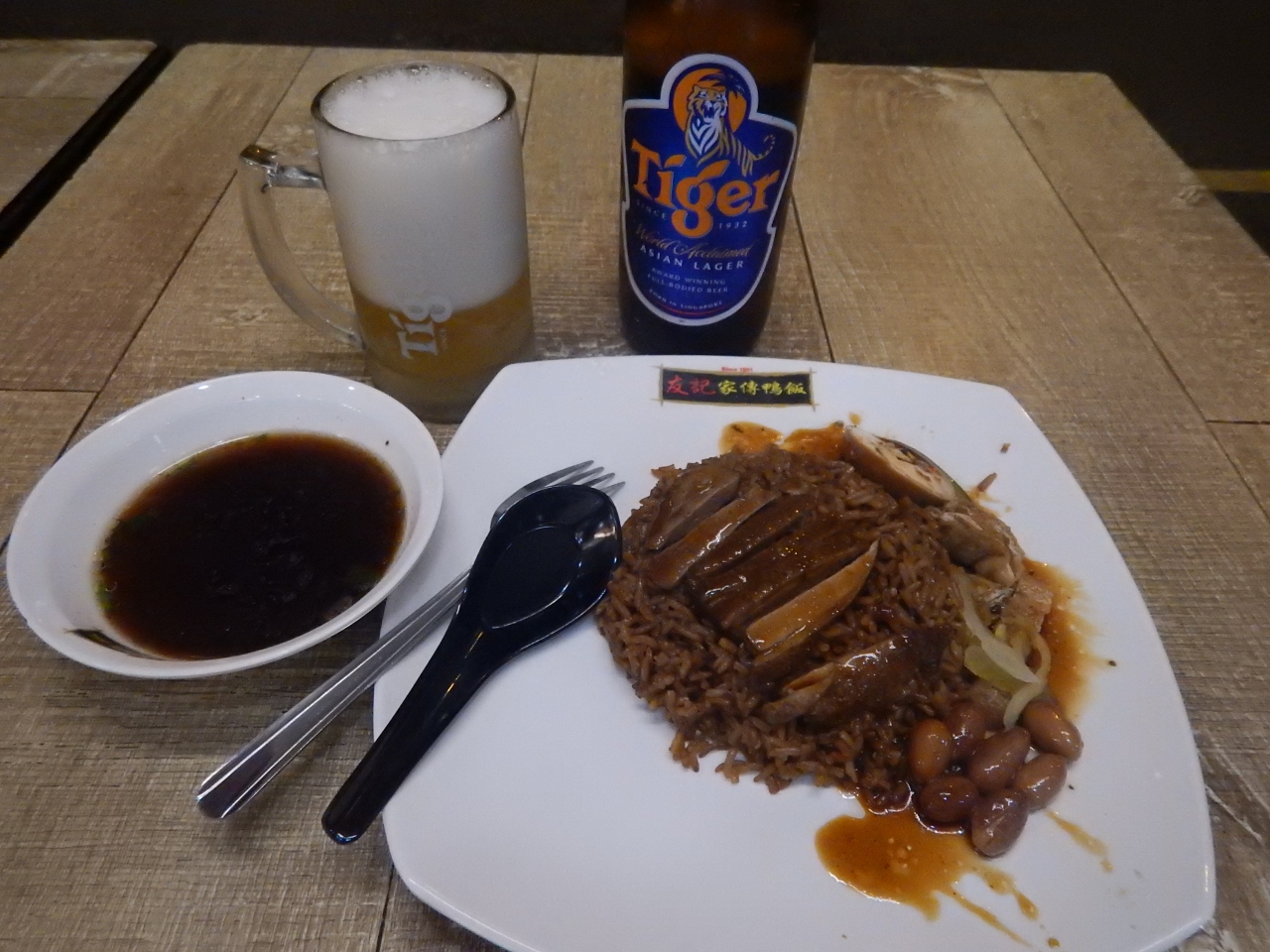 店の看板には「トラデッショナルダックライス」と書いてあるのに、前回は異なるものを食べたので、今回はダックライスを食べることにした。黒っぽいソースが特徴だ。味はまあまあ。ビールのつまみには合った。ダックライス4.5$。タイガービ―ル7.2$だった。