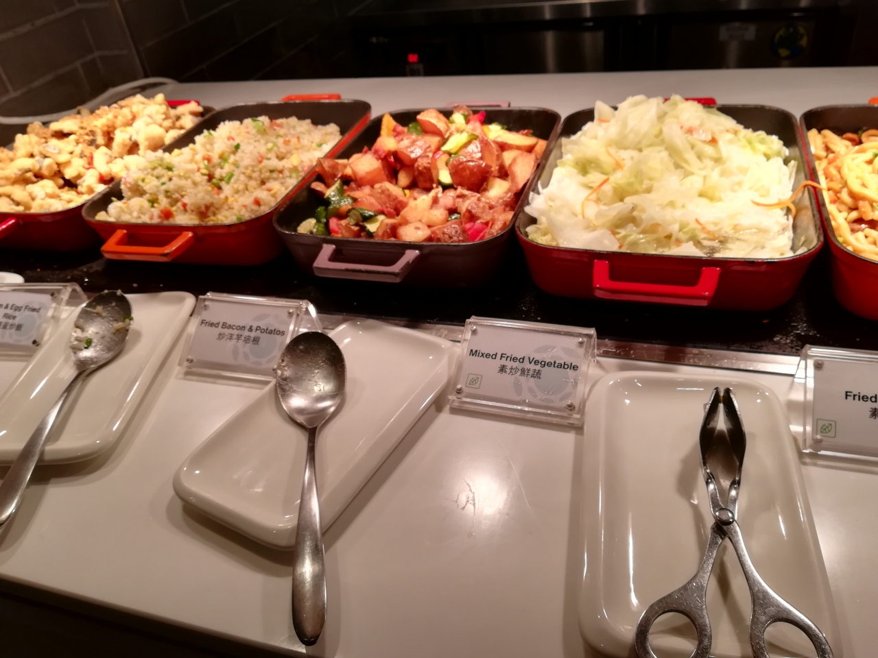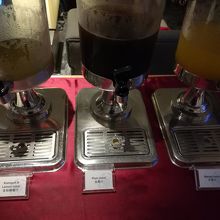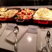 ホットミールが5種類、サラダバー、冷菓が数種、クラッカーなどが詰まったガラス瓶、パン、オーダーしてその場で提供してくれる料理が3~4種類、ジュースサーバー、ビールサーバーなど。冷蔵庫に缶ジュースやワインが置かれています。