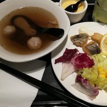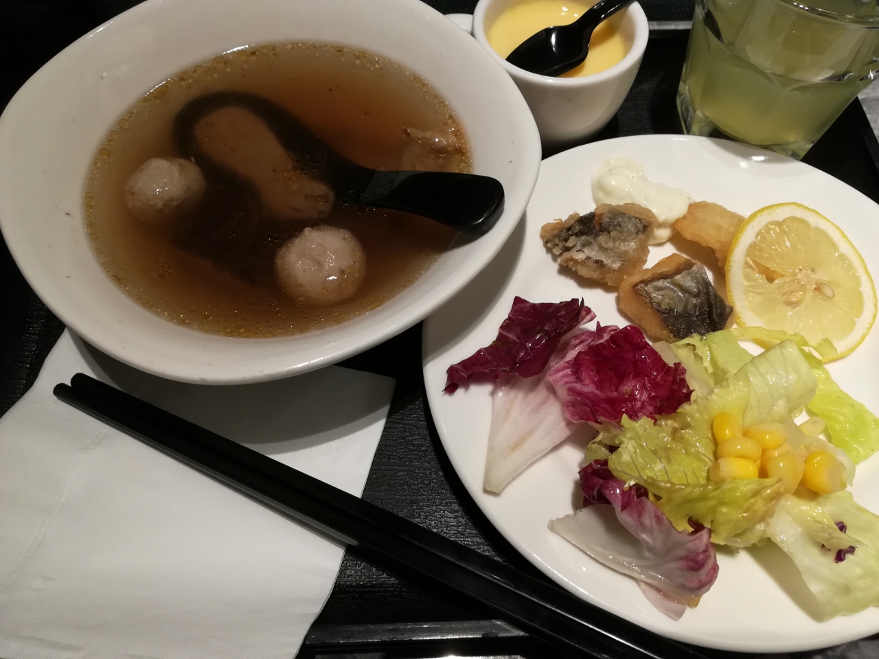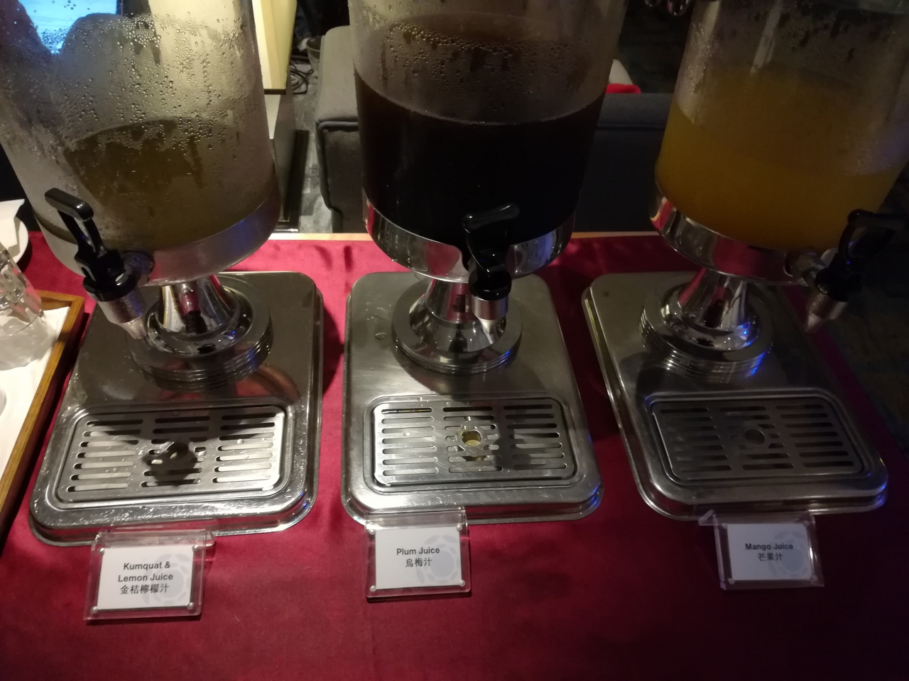 テーブル付きの椅子が少ないので、ひじ掛け横のスタンドなどが置いてある場所に、料理が乗ったトレーを置いていました。