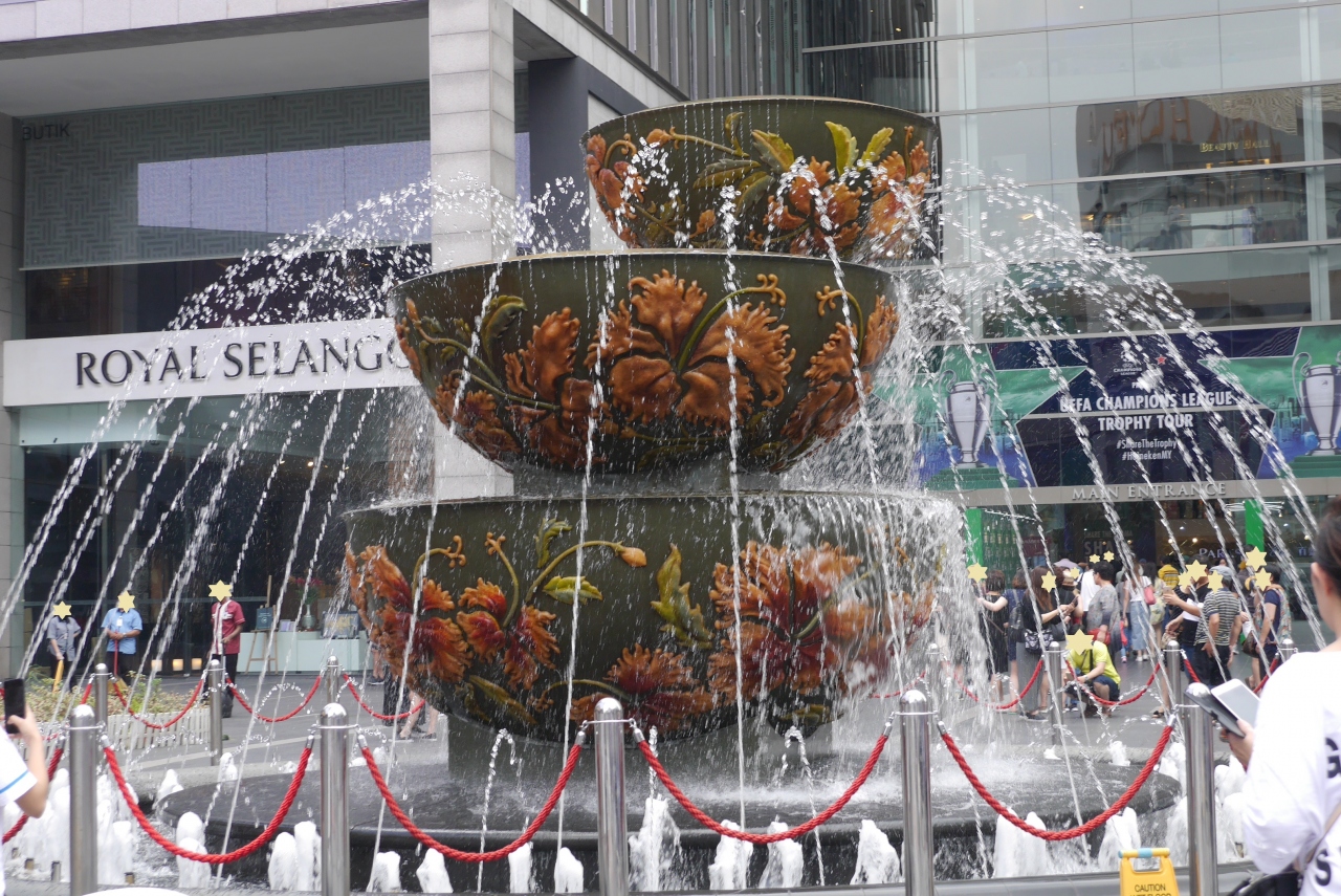 入り口前には大きな噴水があり、暑い中歩き廻ってここに来ると涼しさを感じます。水流が時々変化し、水量が少ない時は中央の噴水の飾りが良く見えます。噴水の前で記念撮影する姿も多く見かけました。