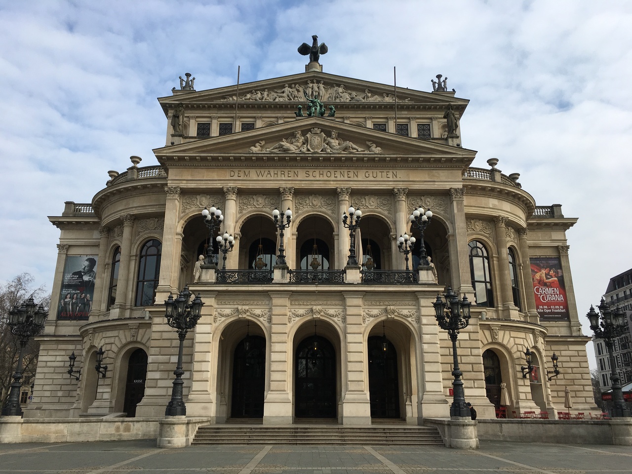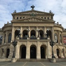 フランクフルト中央駅から徒歩で20分以上掛かりました。真冬の2月に訪れましたが寒さで耳がちぎれそうな感じでした。こちらはかつてオペラハウスだったそうで、今はコンサートホールとして使用されています。実際の目で見ると建物の存在感に圧倒されます。写真を撮る観光客が沢山います。