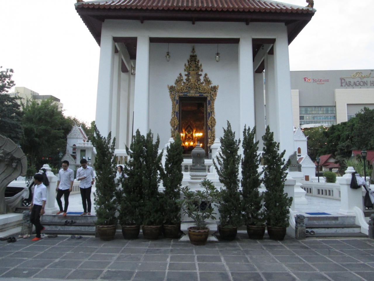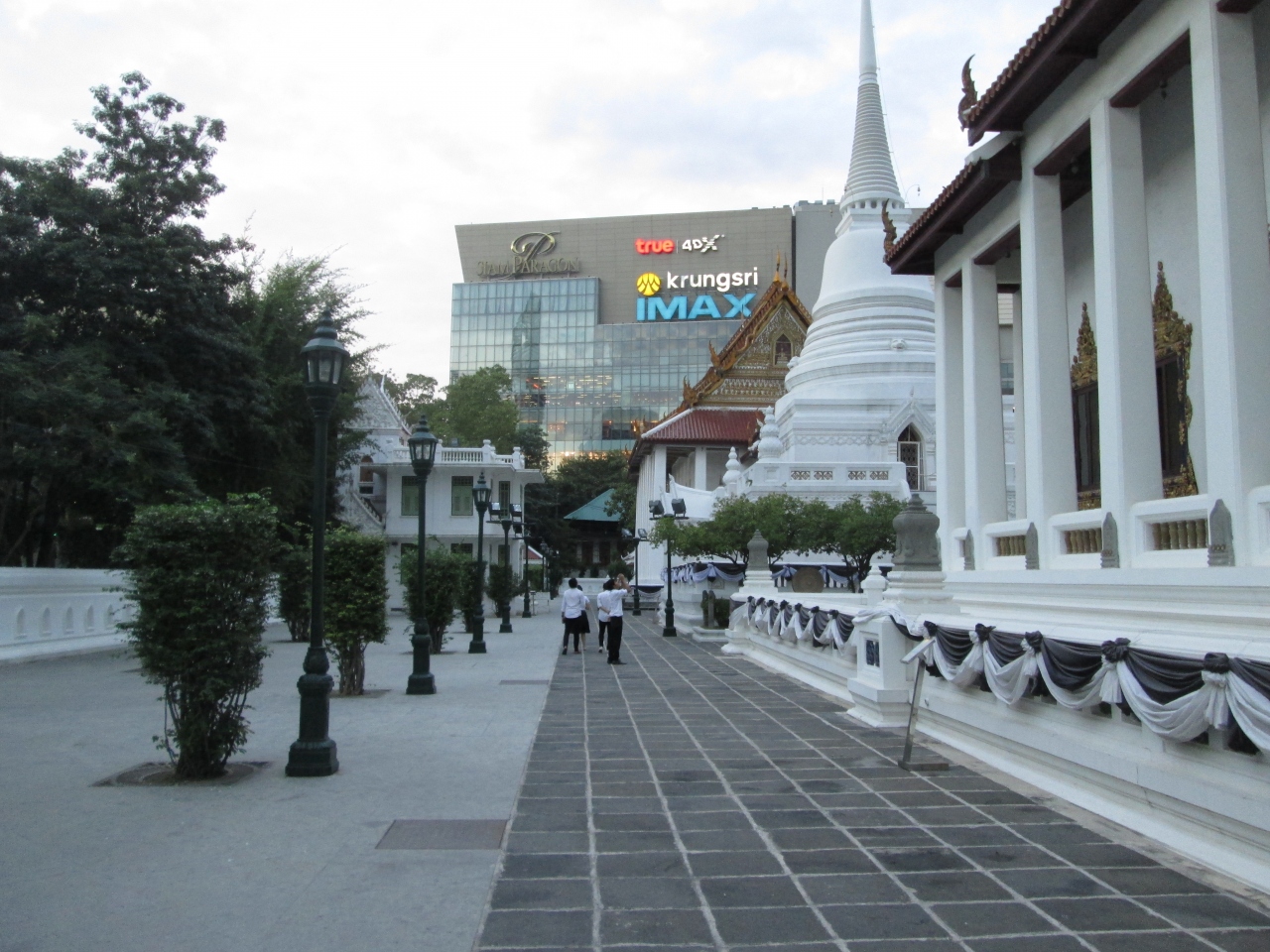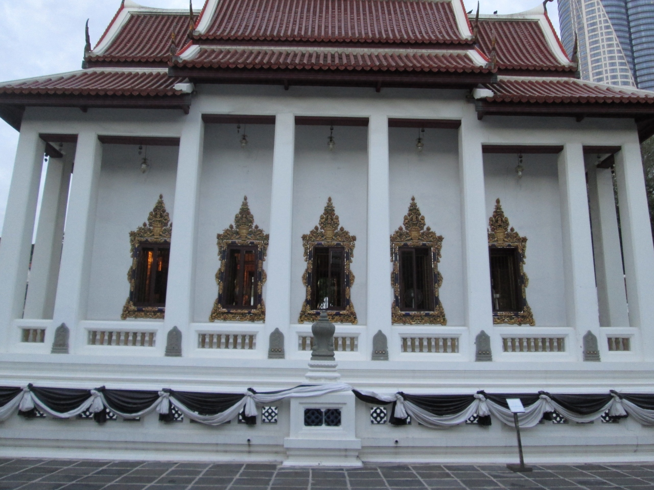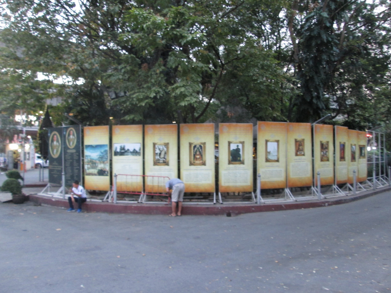 プミポン国王のご逝去に際して、街にはいつも以上に王様の写真を掲げているのが目立ちました。国を挙げての服喪期間となっており、ワットパトゥムワンナラームのエントランスには服喪中の幕が飾られていました。本堂自体は入って見学することができましたが暗めの照明で、何となく寂しさといつも以上の静寂さがありました。