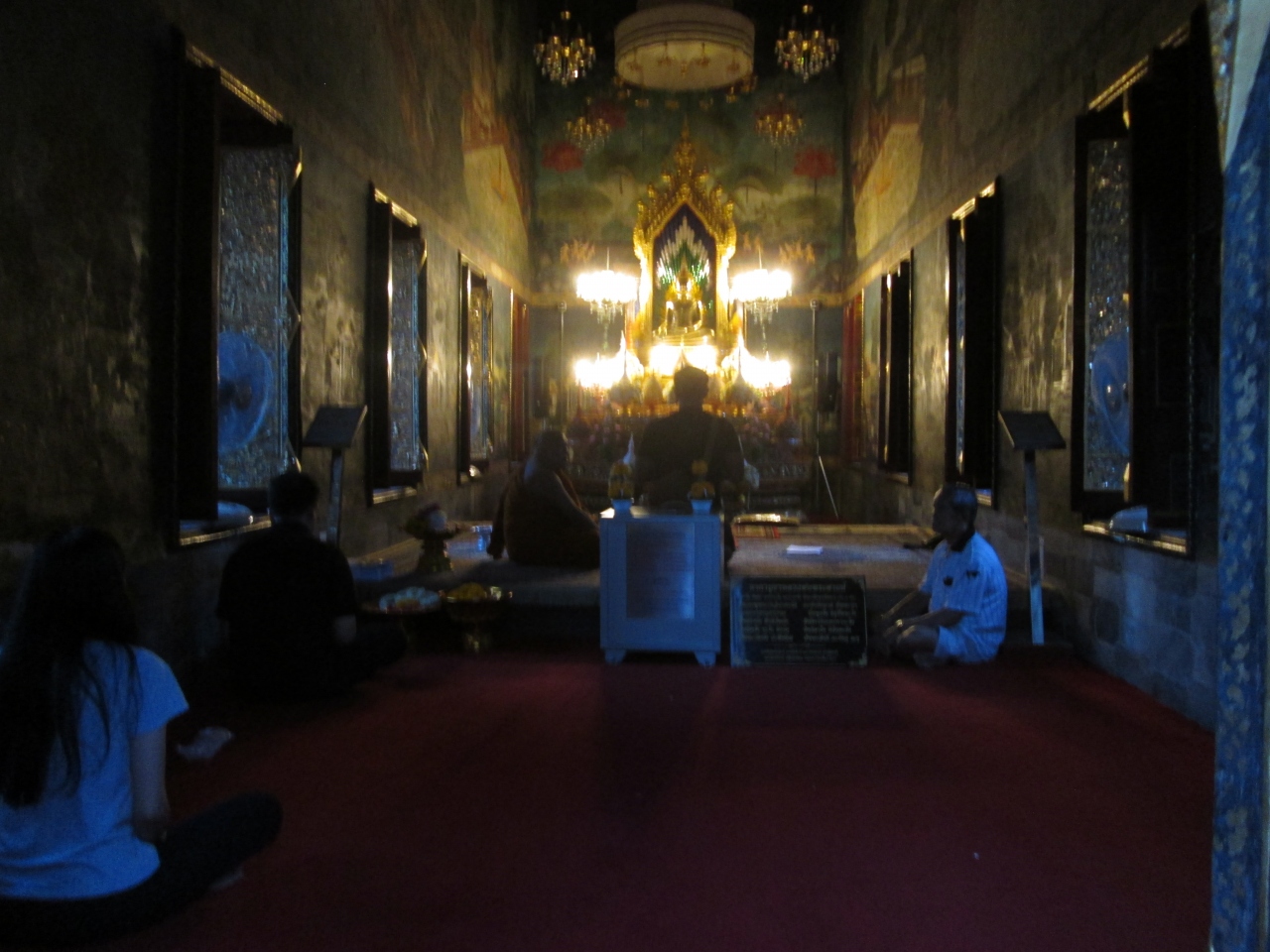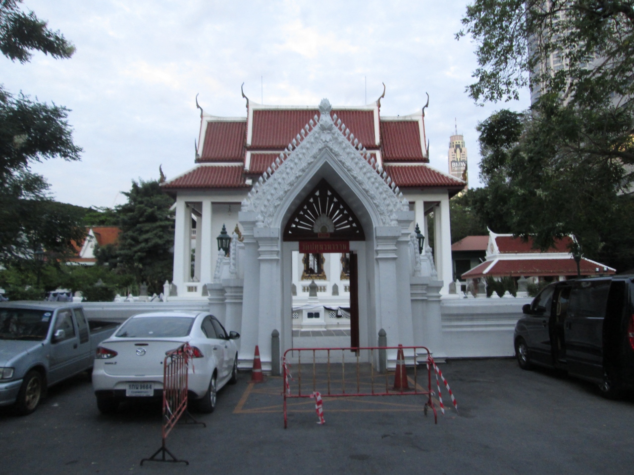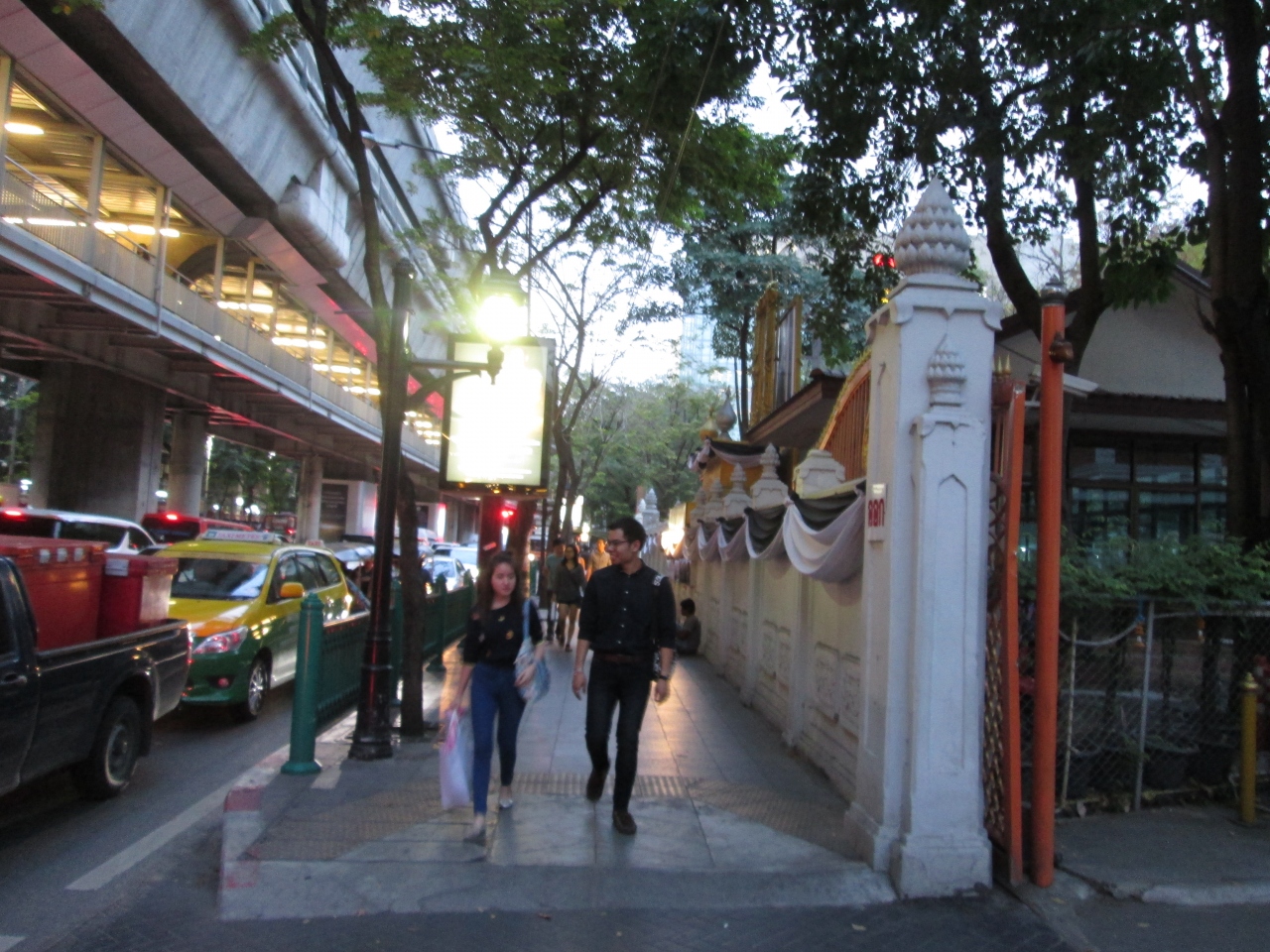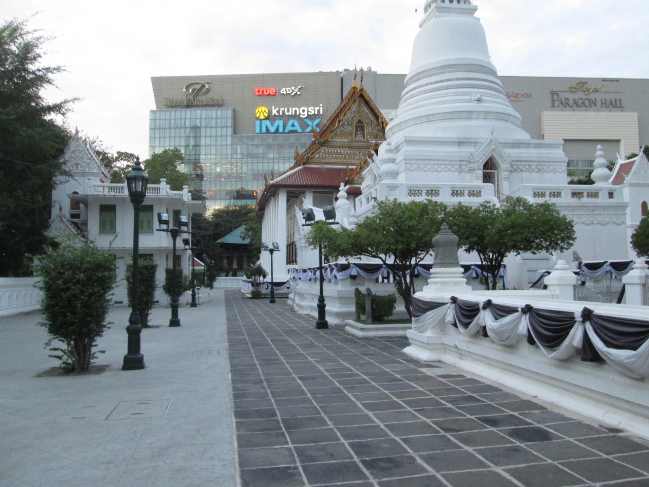 プミポン国王のご逝去に際して、街にはいつも以上に王様の写真を掲げているのが目立ちました。国を挙げての服喪期間となっており、ワットパトゥムワンナラームのエントランスには服喪中の幕が飾られていました。本堂自体は入って見学することができましたが暗めの照明で、何となく寂しさといつも以上の静寂さがありました。